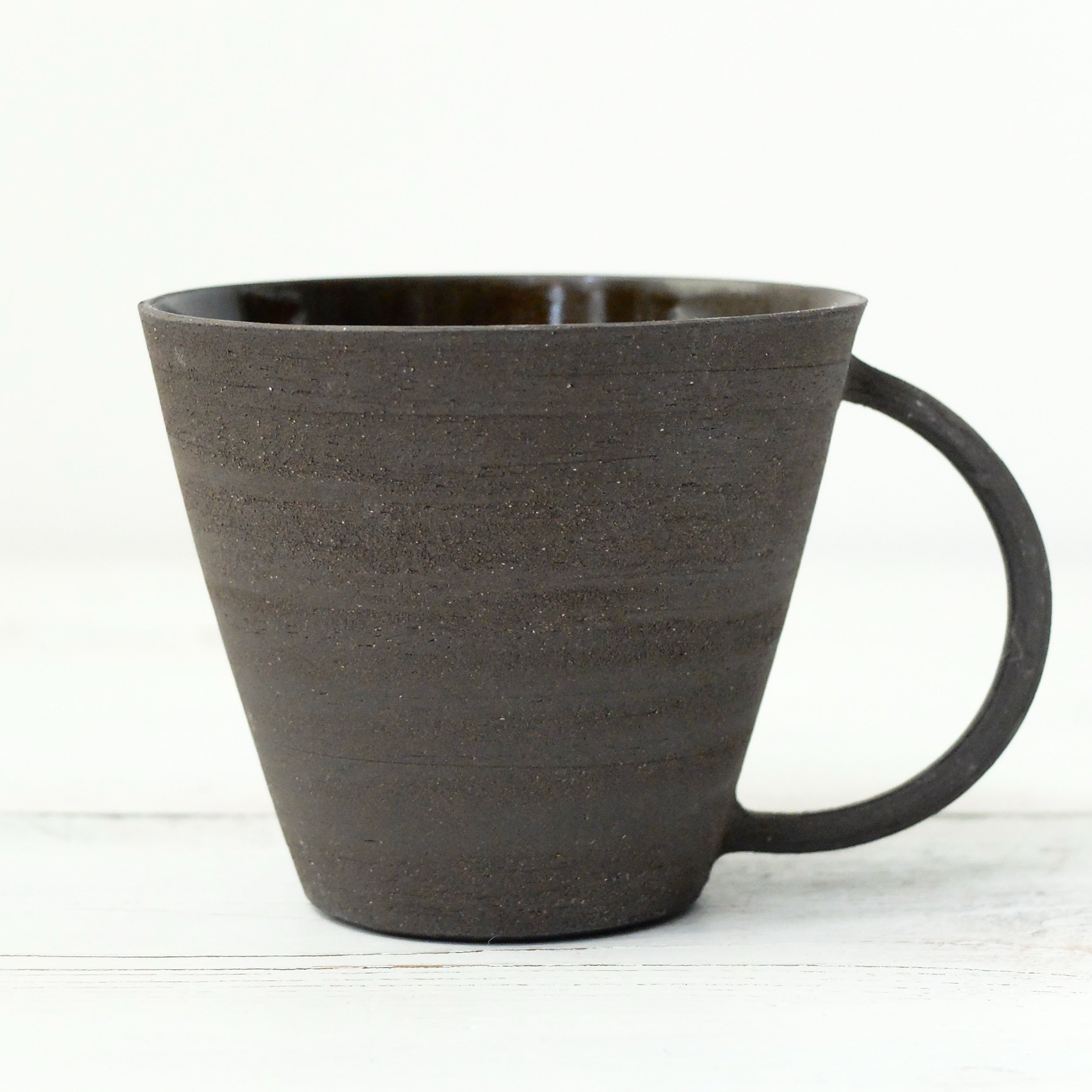 Wheel thrown cup with black brown matt exterior and gloss interior.