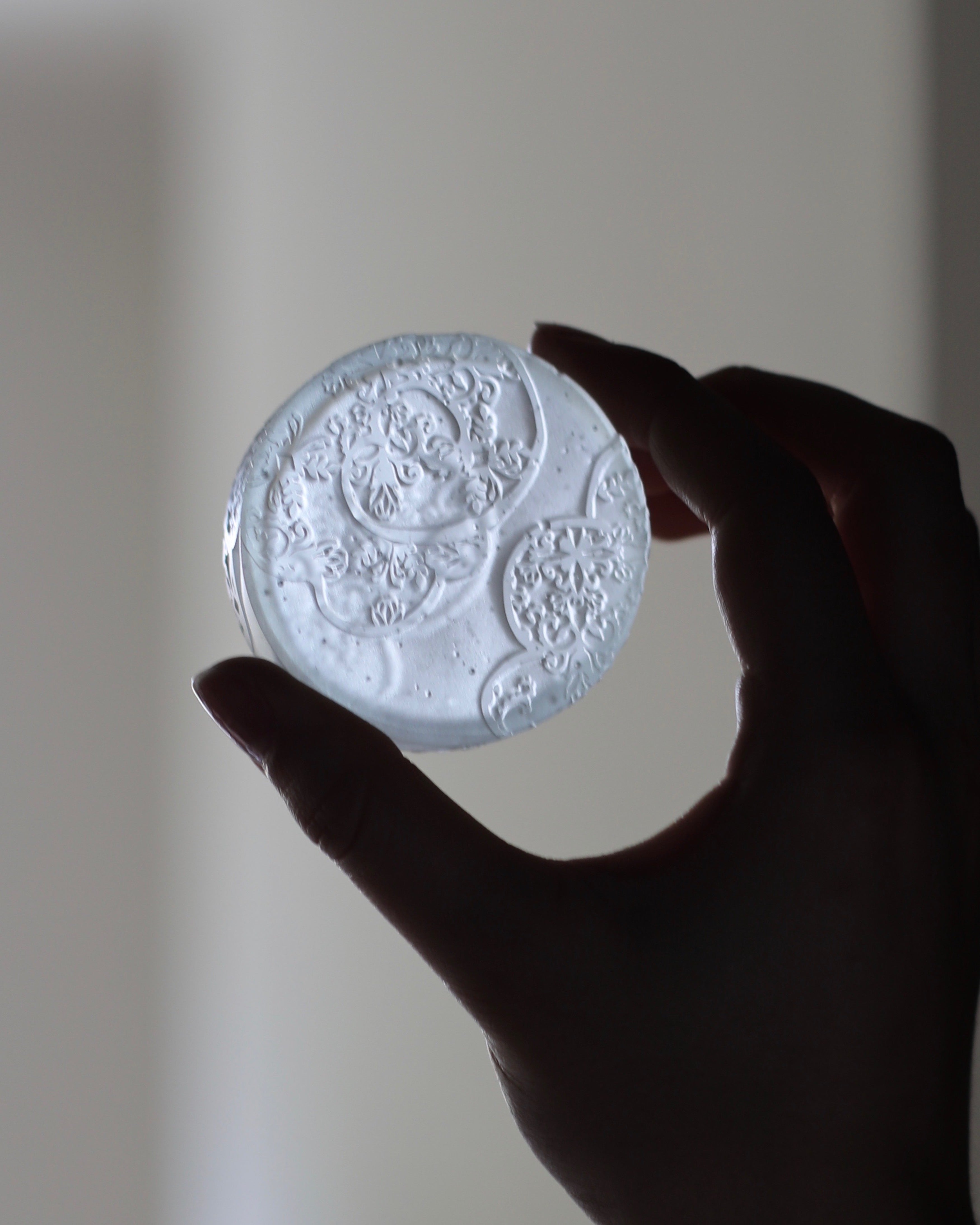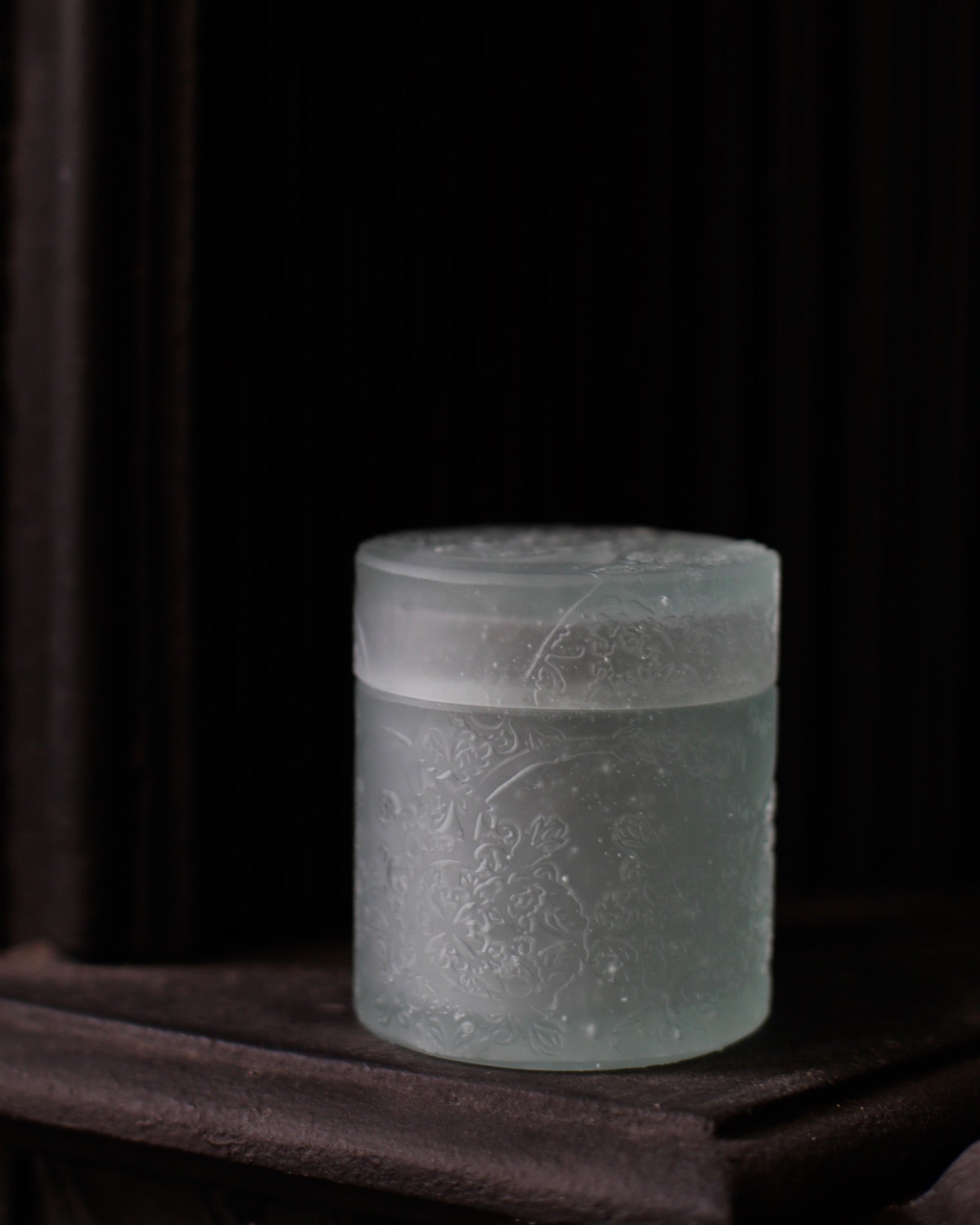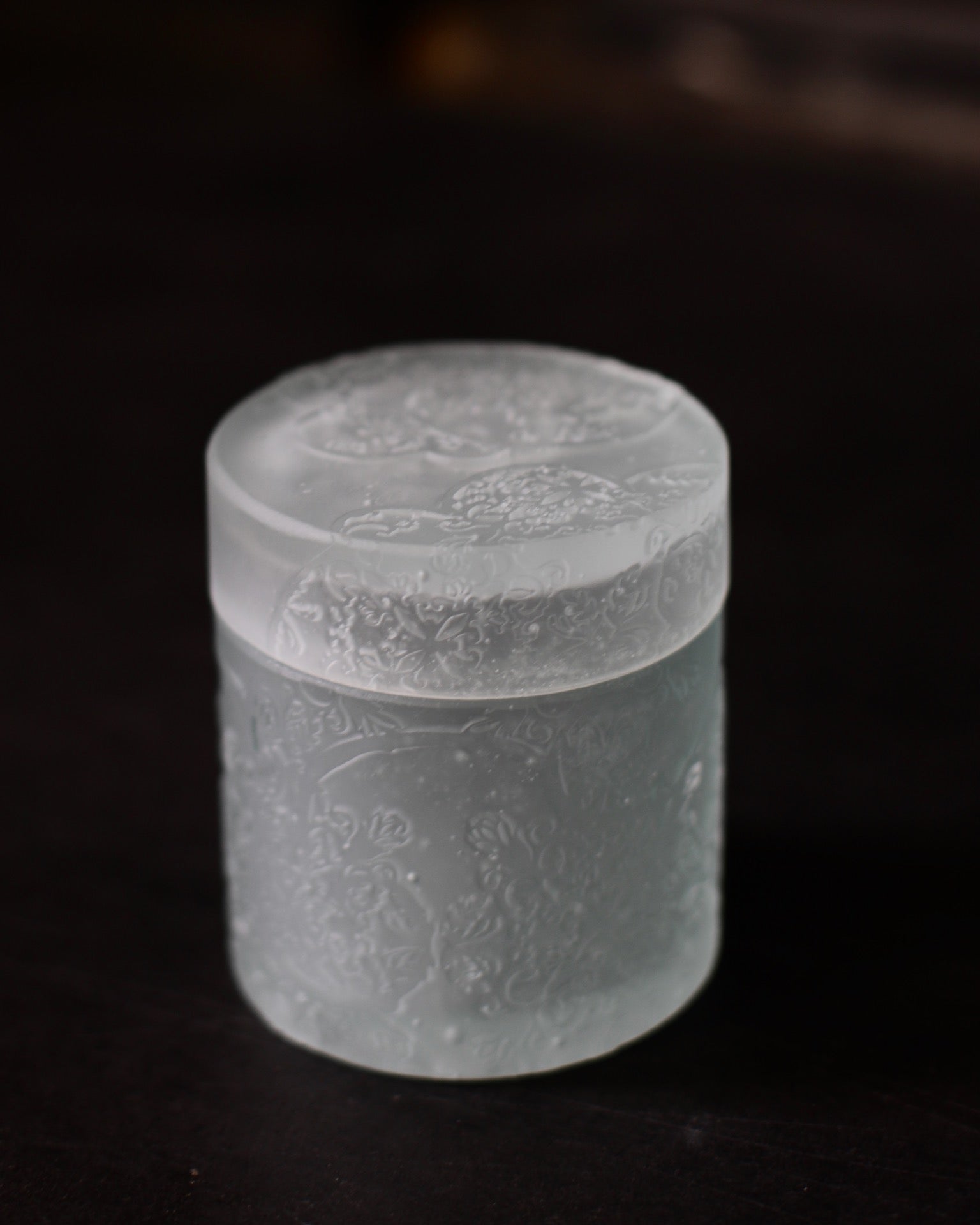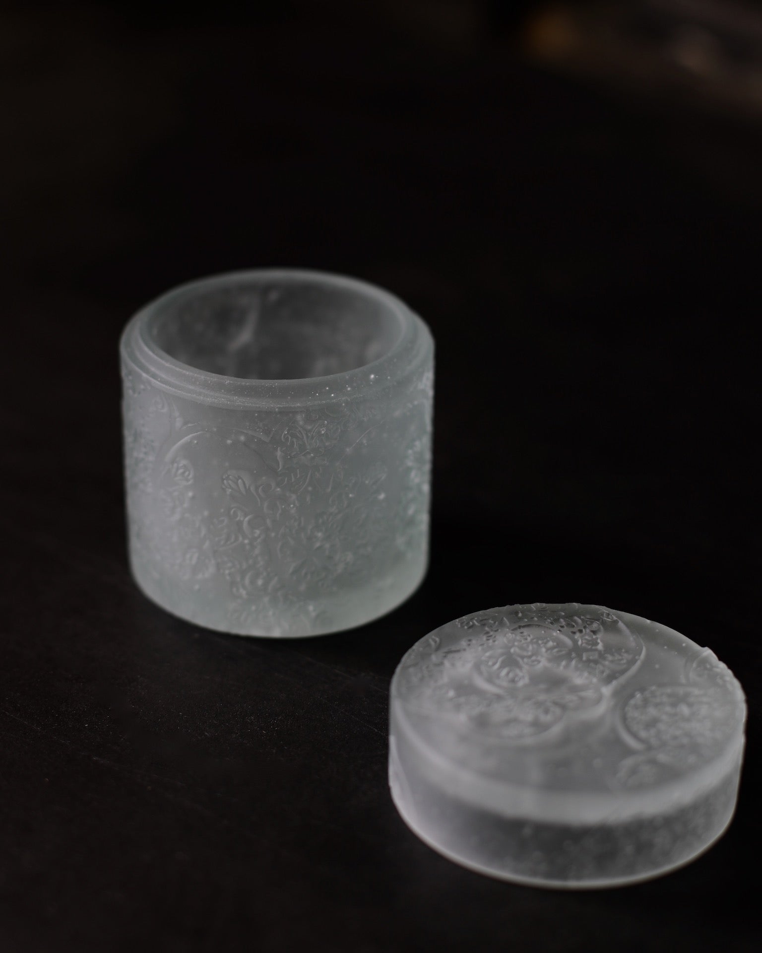 Presented here is a true testament to the diligence of craftsmanship. Kiln cast and finished by hand through an assiduous and long process of cold working- that is, carving moulding, and sandblasting - this cylindrical box features frosted glass and intricate, decorative floral carvings. The lid even harbours a concealed floral design on the reverse. Intended to hold something precious, Matsuda believes that something ‘precious’ is something that embraces temporality and holds hope for the future: a ring, a stone, a leaf, or even the air, something whose value is not determined by others but reflects a person’s life. Thus, her glass boxes are titled ‘ときの箱 (Toki no Hako) - The Box of Time.’ Matsuda hopes that her ‘boxes of time’ will enhance the lives of their users and encourage them to reconsider things we often overlook.