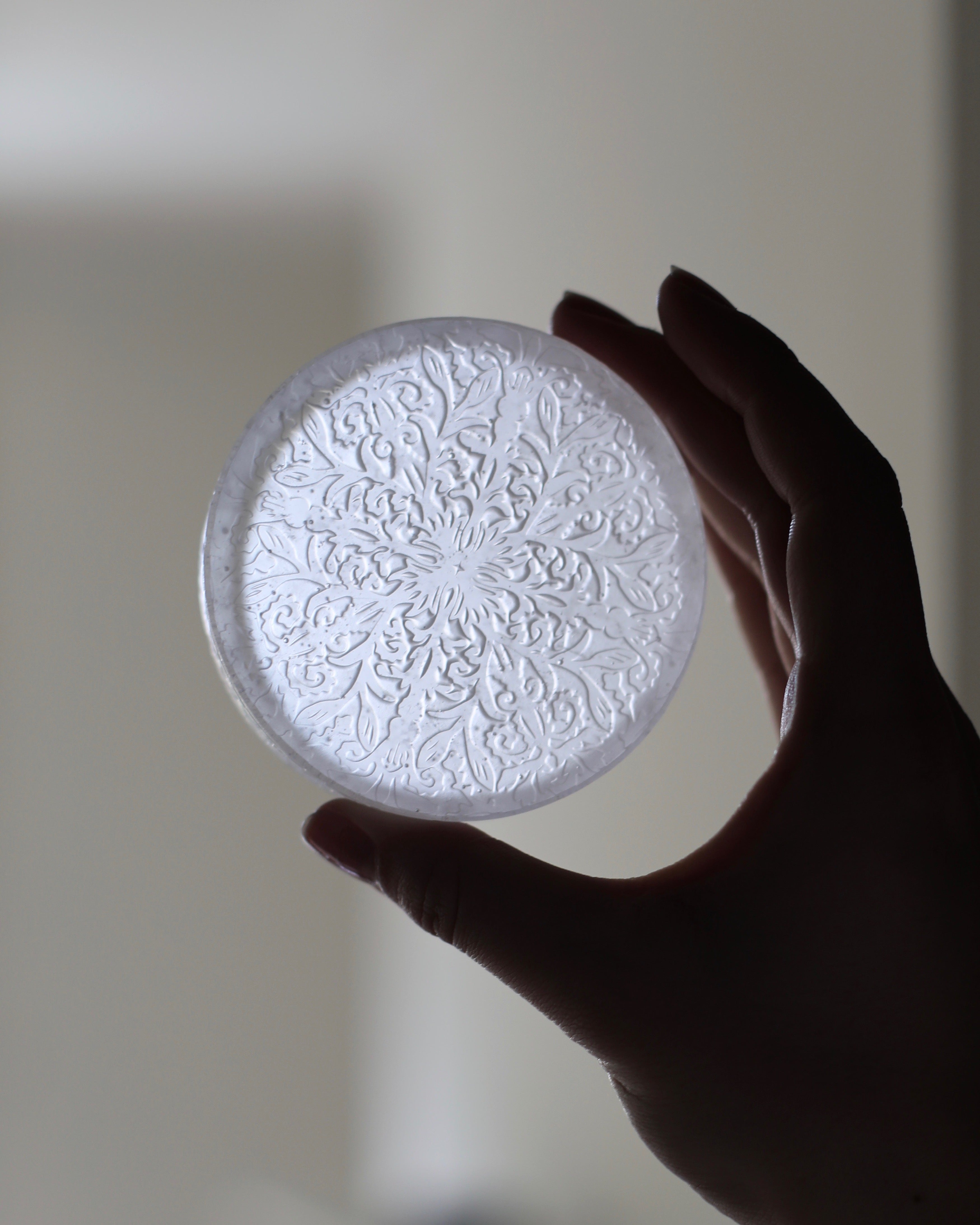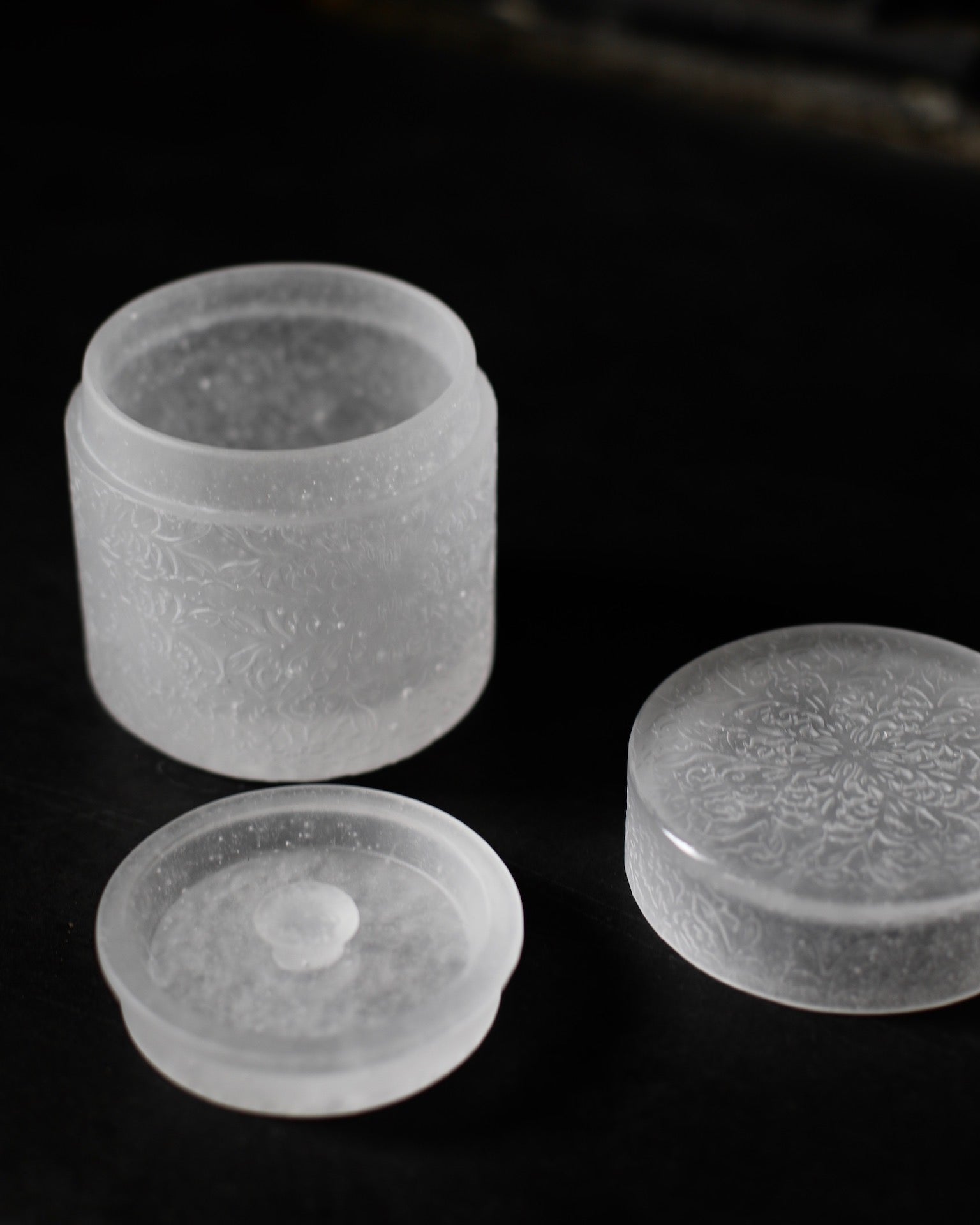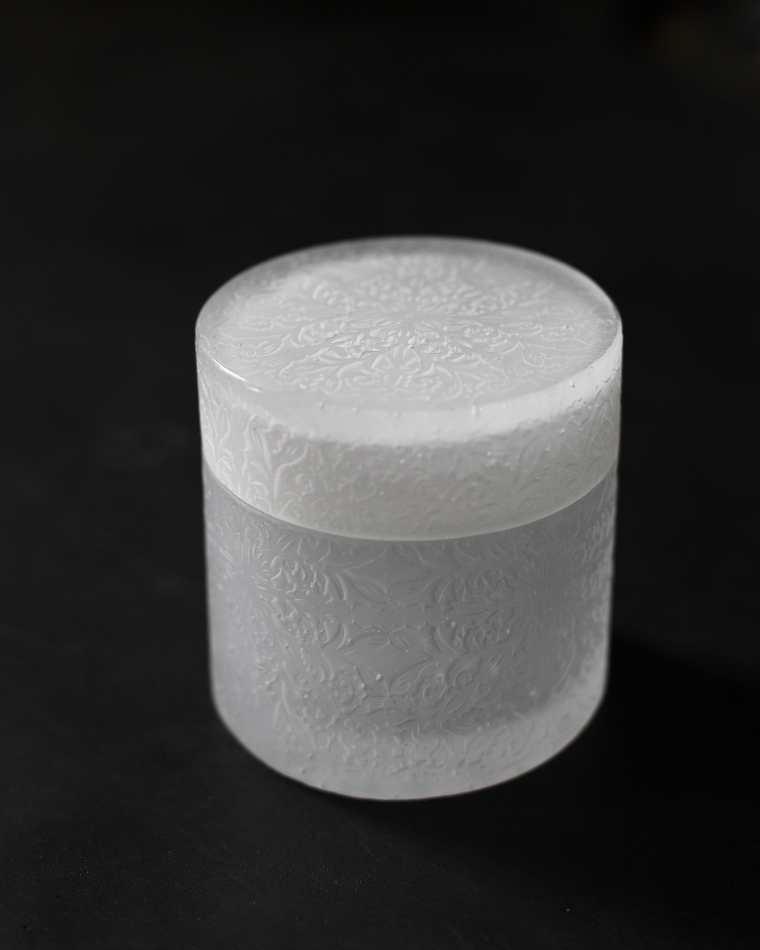 Presented here is a true testament to the assiduity of craftsmanship. Kiln cast and finished by hand through a diligent and long process of cold working- that is, carving moulding, and sandblasting - this cylindrical box features translucent frosted glass, an internal division and intricate, decorative floral carvings. Intended to hold something precious, Matsuda believes that something ‘precious’ is something that embraces temporality and holds hope for the future: a ring, a stone, a leaf, or even the air, something whose value is not determined by others but reflects a person’s life. Thus, her glass boxes are titled ‘ときの箱 (Toki no Hako) - The Box of Time.’ Matsuda hopes that her ‘boxes of time’ will enhance the lives of their users and encourage them to reconsider things we often overlook.