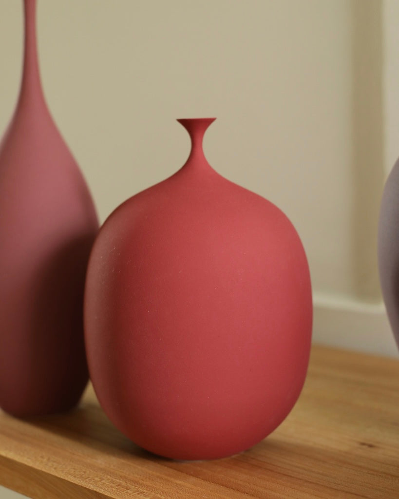 A poetic form finished with a characterful tone, Cook is continually influenced by the beautiful Suffolk landscape, through the kaleidoscope of colour surrounding her. She chooses the tone of the vessel is to align with its form, resulting in a completely unique piece. They require great skill to create, due to the delicate neck of the vessels, which Sophie has developed through her practice.
