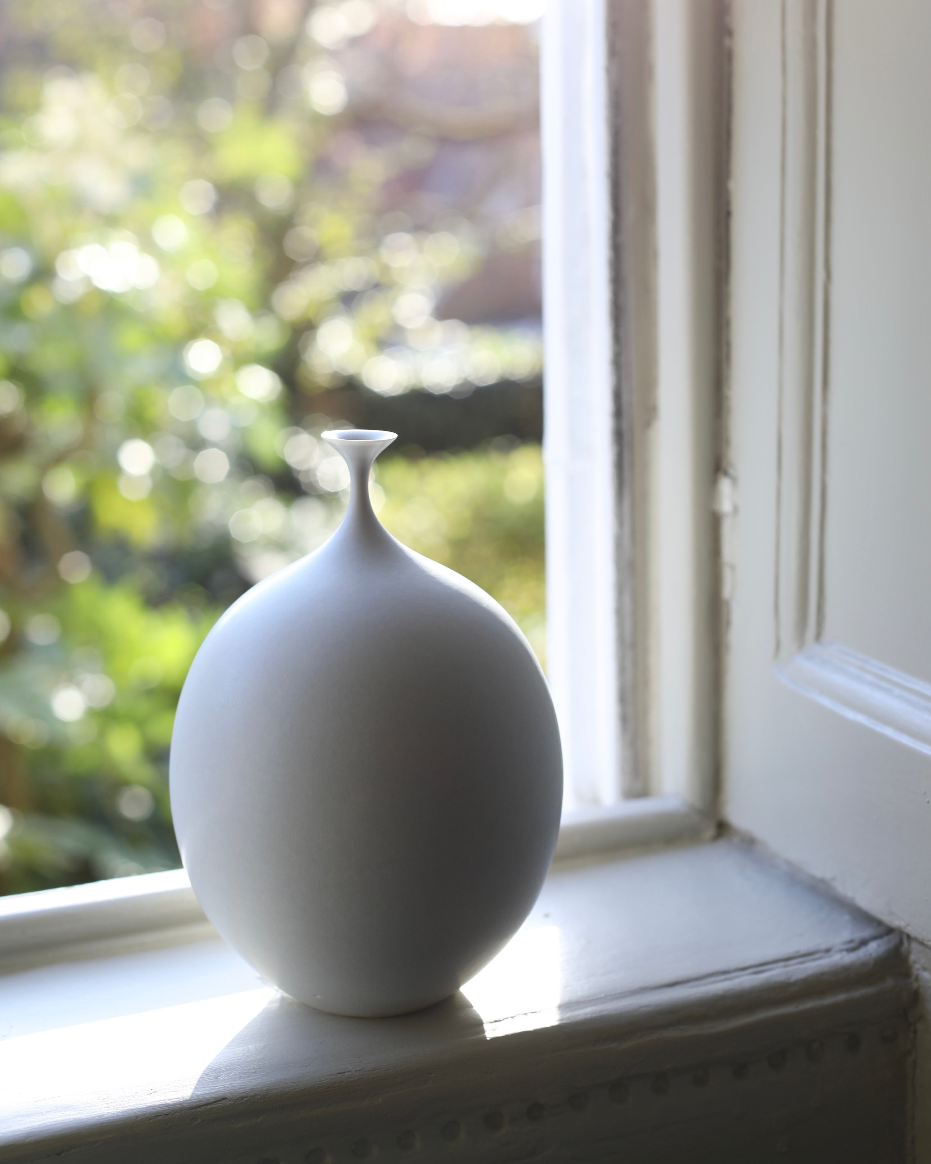 A poetic form finished with a characterful tone, Cook is continually influenced by the beautiful Suffolk landscape, through the kaleidoscope of colour surrounding her. She chooses the tone of the vessel is to align with its form, resulting in a completely unique piece. They require great skill to create, due to the delicate neck of the vessels, which Sophie has developed through her practice.