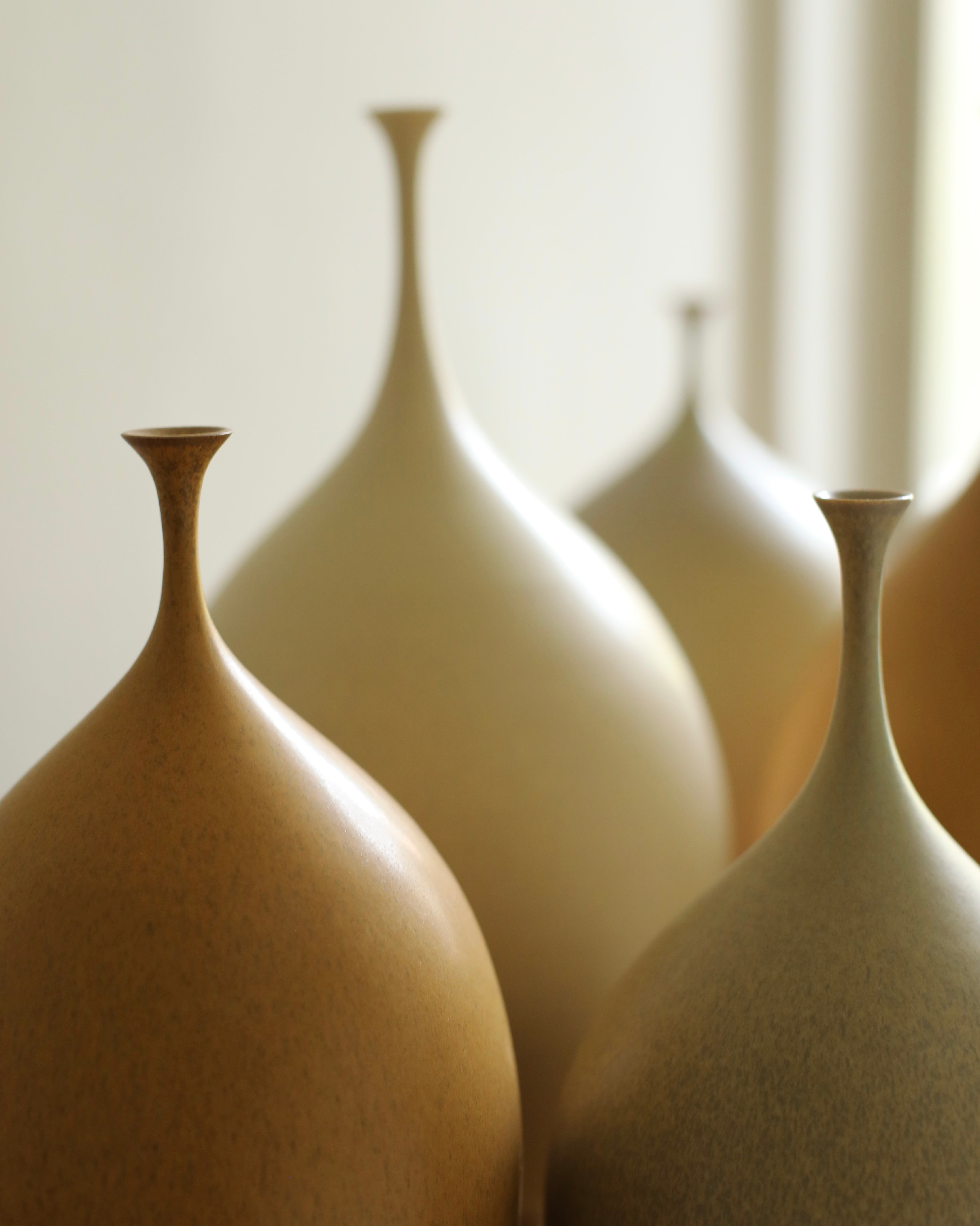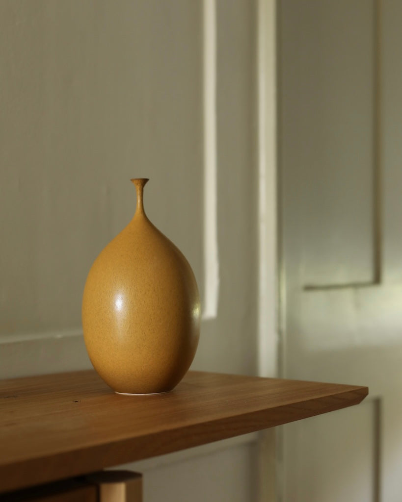 A poetic form finished with a characterful tone, Cook is continually influenced by the beautiful Suffolk landscape, through the kaleidoscope of colour surrounding her. She chooses the tone of the vessel is to align with its form, resulting in a completely unique piece. They require great skill to create, due to the delicate neck of the vessels, which Sophie has developed through her practice.