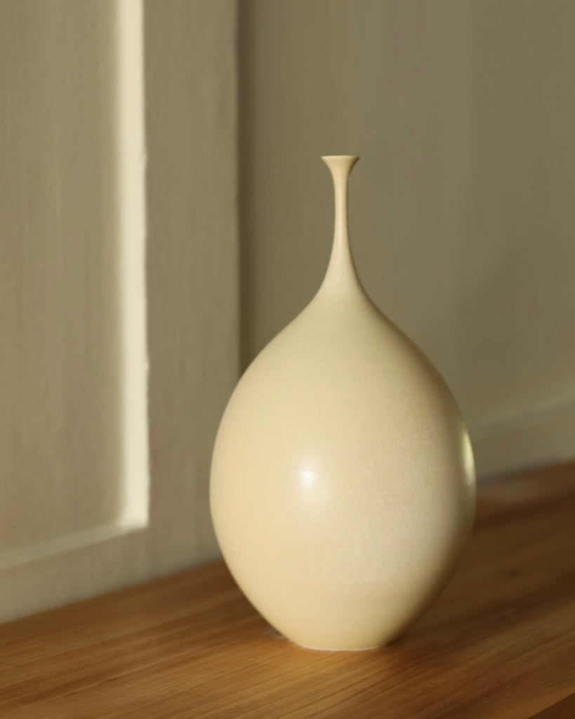 A poetic form finished with a characterful tone, Cook is continually influenced by the beautiful Suffolk landscape, through the kaleidoscope of colour surrounding her. She chooses the tone of the vessel is to align with its form, resulting in a completely unique piece. They require great skill to create, due to the delicate neck of the vessels, which Sophie has developed through her practice.