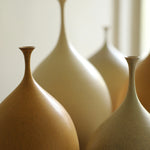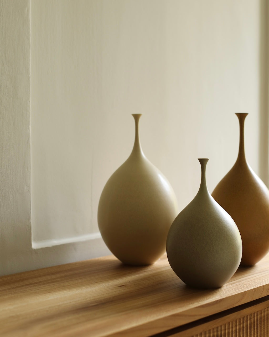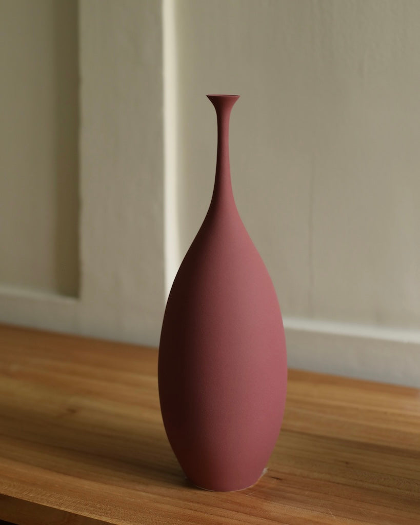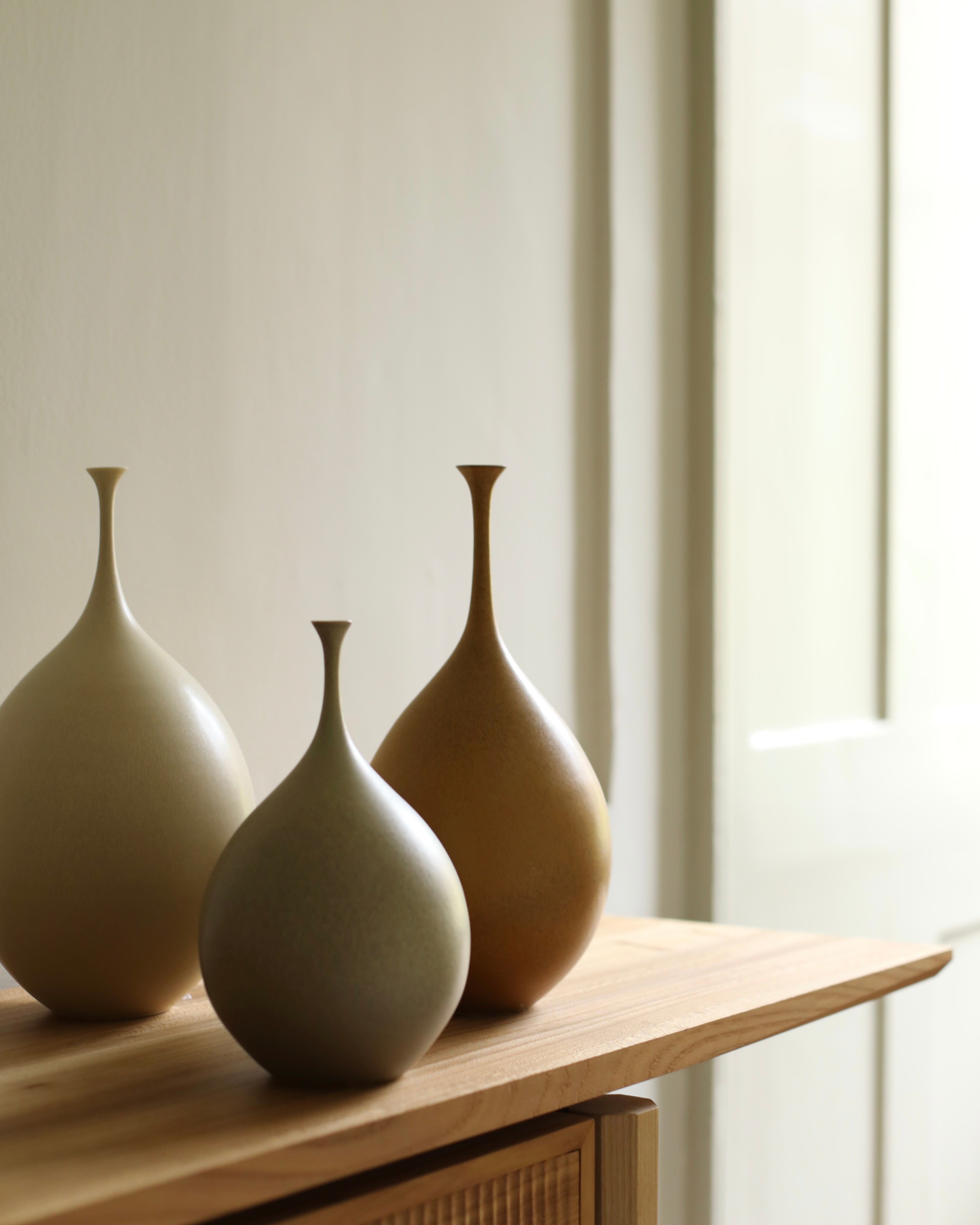 A poetic form finished with a characterful tone, Cook is continually influenced by the beautiful Suffolk landscape, through the kaleidoscope of colour surrounding her. She chooses the tone of the vessel is to align with its form, resulting in a completely unique piece. They require great skill to create, due to the delicate neck of the vessels, which Sophie has developed through her practice.