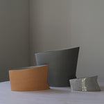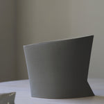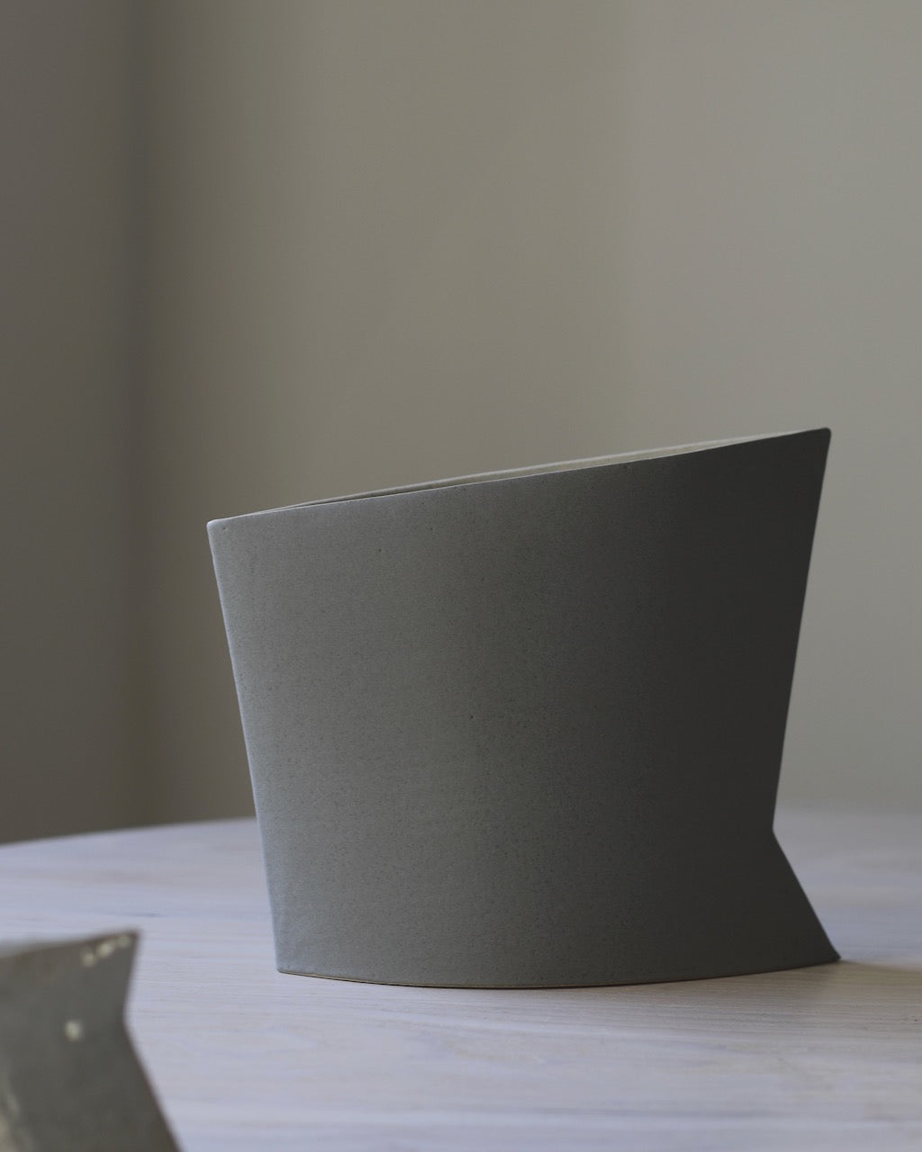 Sun Kim has eloquently hand-crafted this perfectly formed elliptical vessel. Her making process involves wheel throwing, hand building and assembling. Kim produces functional pieces that re-examine traditional techniques, producing sophisticated contemporary vessels inspired by architecture and nature. The construction of this stoneware vessel is particularly refined, featuring a distinct geometrical edge and a sleek, streamlined form. This piece features subtle linear haptic marks in a matte, warm grey hue offset with an uncoloured gloss stoneware interior. This piece will work well individually or as part of a group.
