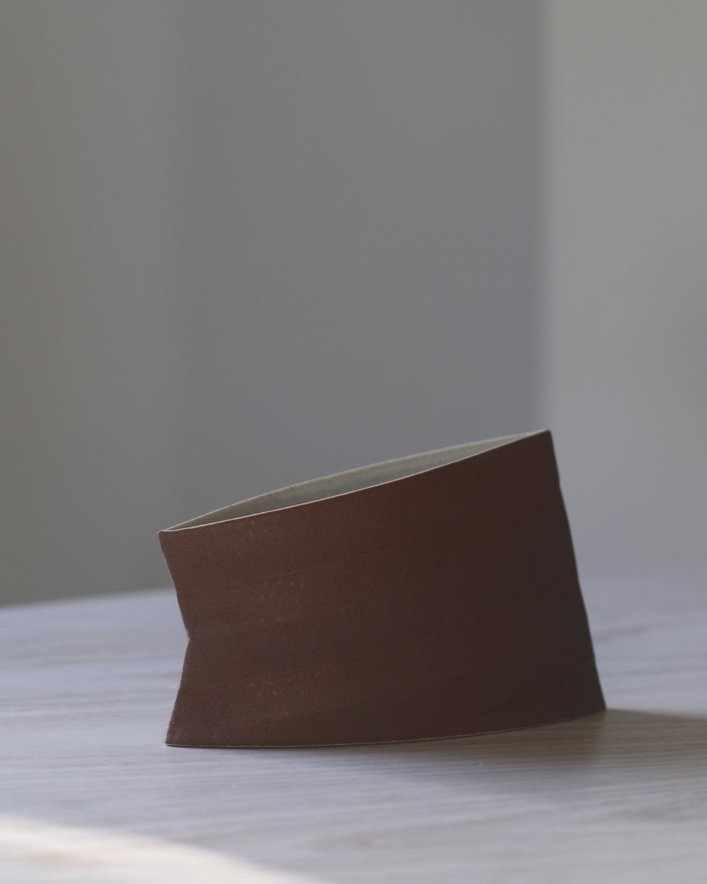 Sun Kim has eloquently hand-crafted this perfectly formed elliptical vessel. Her making process involves wheel throwing, hand building and assembling. Kim produces functional pieces that re-examine traditional techniques, producing sophisticated contemporary vessels inspired by architecture and nature. The construction of this stoneware vessel is particularly refined, featuring a distinct geometrical edge and a sleek, streamlined form. This piece is finished in a soft, finely mottled grey-brown matte glaze. It features a subtle, sequential, linear textured motif offset with an uncoloured gloss stoneware interior. This piece will work well individually or as part of a group.