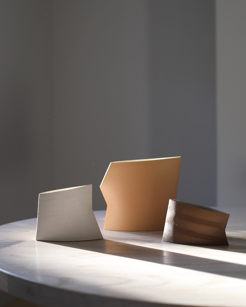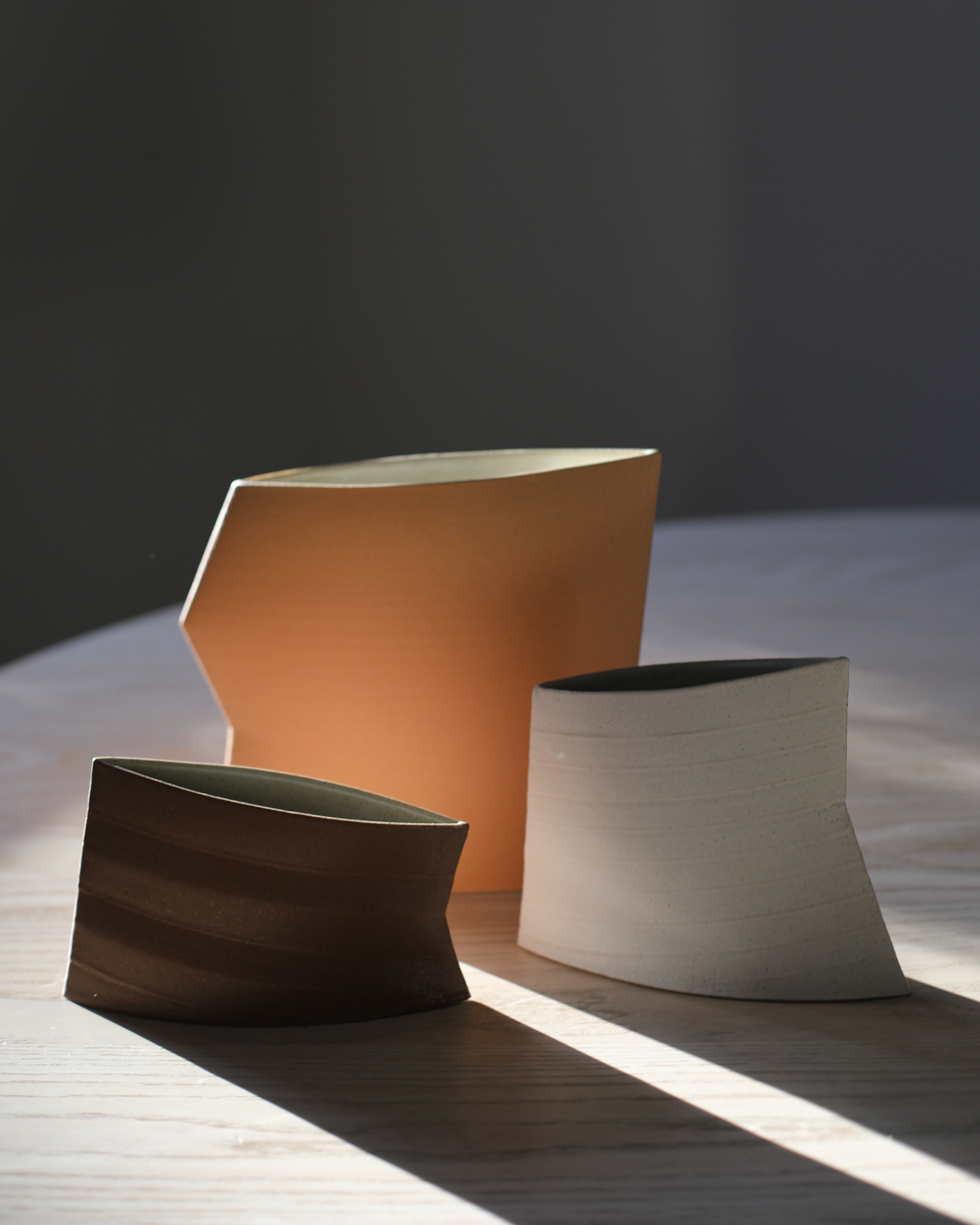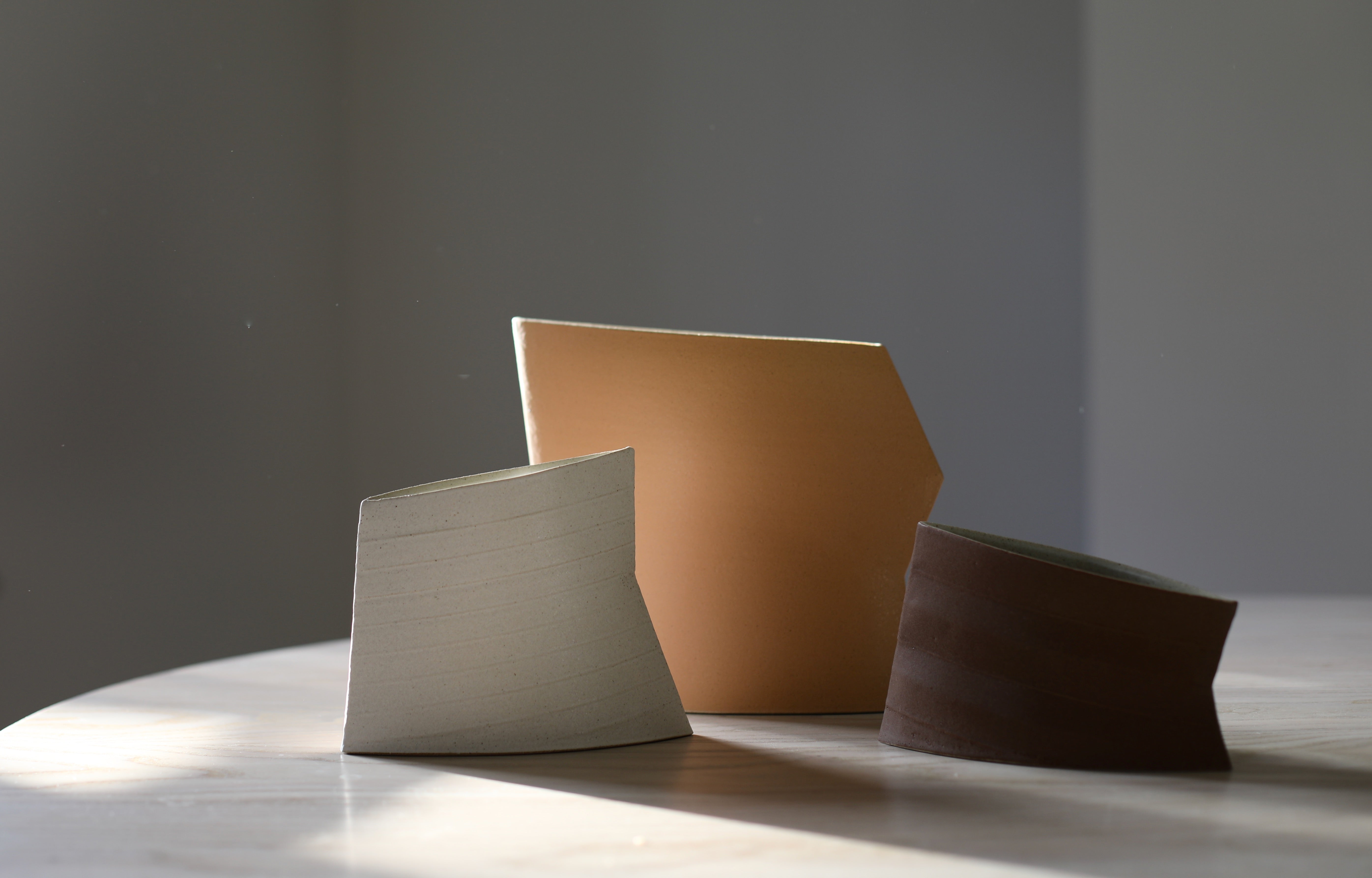 Sun’s distinctive functional ceramics explore and reconcile the different cultures, tastes and aesthetics which she was exposed to whilst growing up, as well as continually taking inspiration from her surroundings. With porcelain and stoneware Sun creates ceramics which combine both traditional and contemporary aesthetics. Her works originate on the potters wheel and are subsequently cut and assembled using hand building techniques. Sun is continually investigating form and shape through her making process.