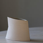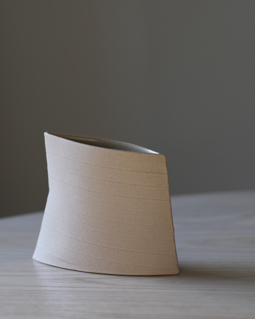 Sun Kim has eloquently hand-crafted this perfectly formed elliptical vessel. Her making process involves wheel throwing, hand building and assembling. Kim produces functional pieces that re-examine traditional techniques, producing sophisticated contemporary vessels inspired by architecture and nature. The construction of this stoneware vessel is particularly refined, featuring a distinct geometrical edge and a sleek, streamlined form. This piece is finished in a soft, neutral, speckled matte glaze. It features a subtle, sequential, linear textured motif offset with an uncoloured gloss stoneware interior. This piece will work well individually or as part of a group.