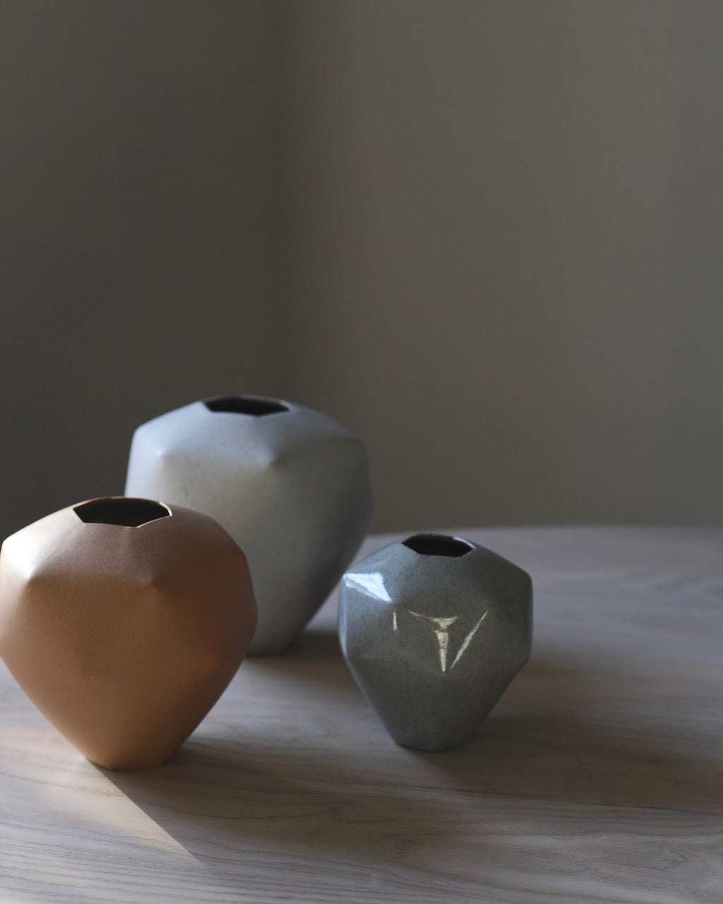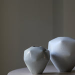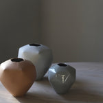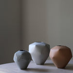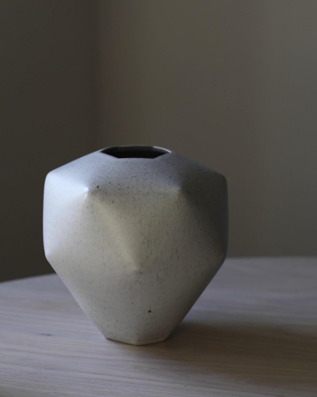 Sun Kim has eloquently hand-crafted this geometric, folded vessel. Her making process involves wheel throwing, hand building and assembling. Kim produces functional pieces that re-examine traditional techniques, producing sophisticated contemporary vessels inspired by architecture and nature. The construction of this stoneware vessel is particularly refined, featuring a distinct geometrical silhouette with a hexagonal mouth and voluminous, spherical body. This piece is finished in a subtle matte, warm-grey glaze with gentle, green-flecked inclusions. This piece will work well individually or as part of a group.