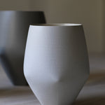 Sun Kim has eloquently hand-crafted this geometric, open vessel. Her making process involves wheel throwing, hand building and assembling. Kim produces functional pieces that re-examine traditional techniques, producing sophisticated contemporary vessels inspired by architecture and nature. The construction of this stoneware vessel is particularly refined, featuring a distinct geometrical silhouette. It has a wide, circular mouth and voluminous body. This piece features subtle, linear haptic marks in a soft, light-grey matte glaze offset with an uncoloured gloss stoneware interior. This piece will work well individually or as part of a group.