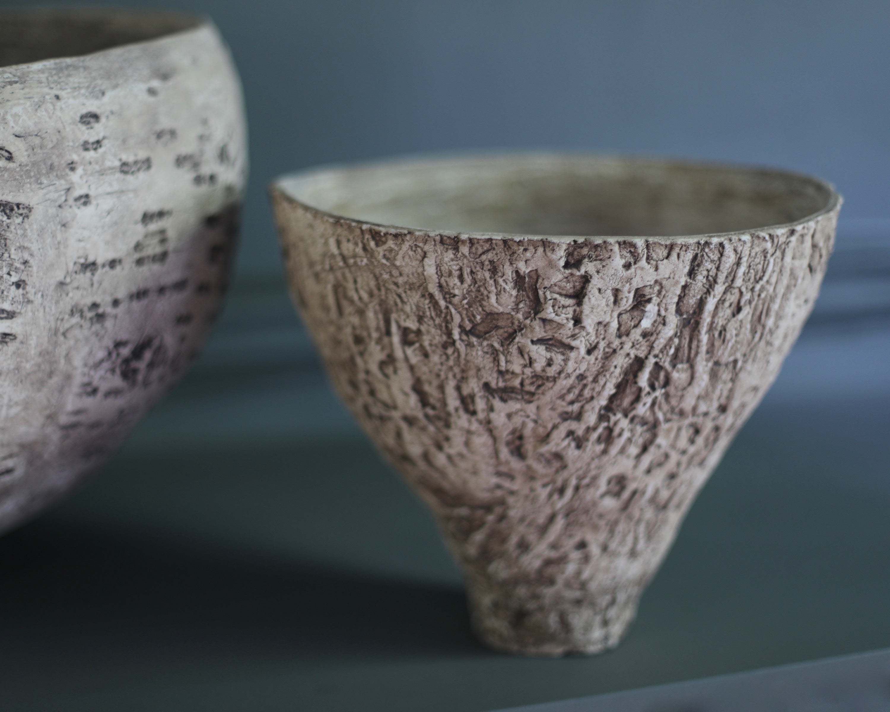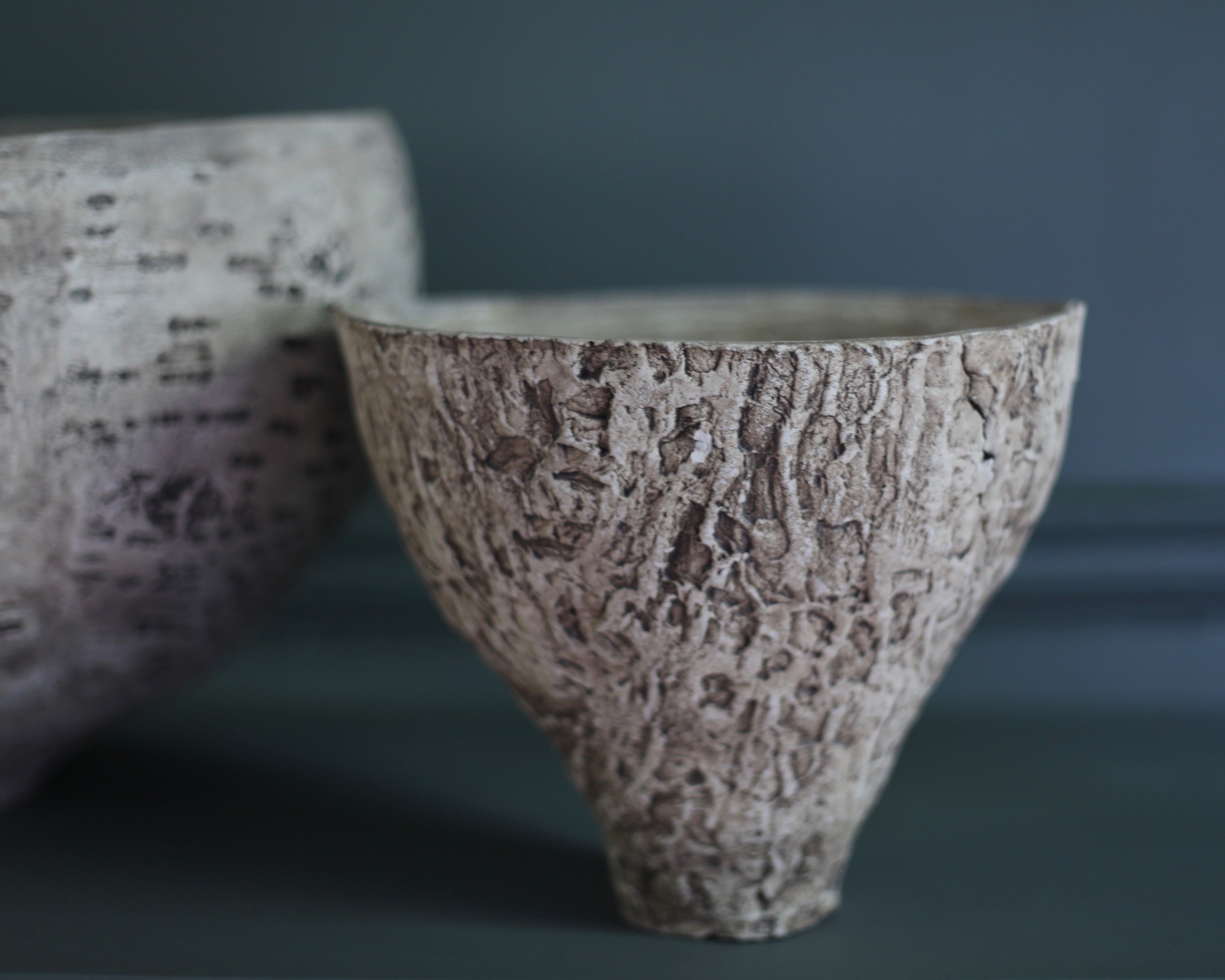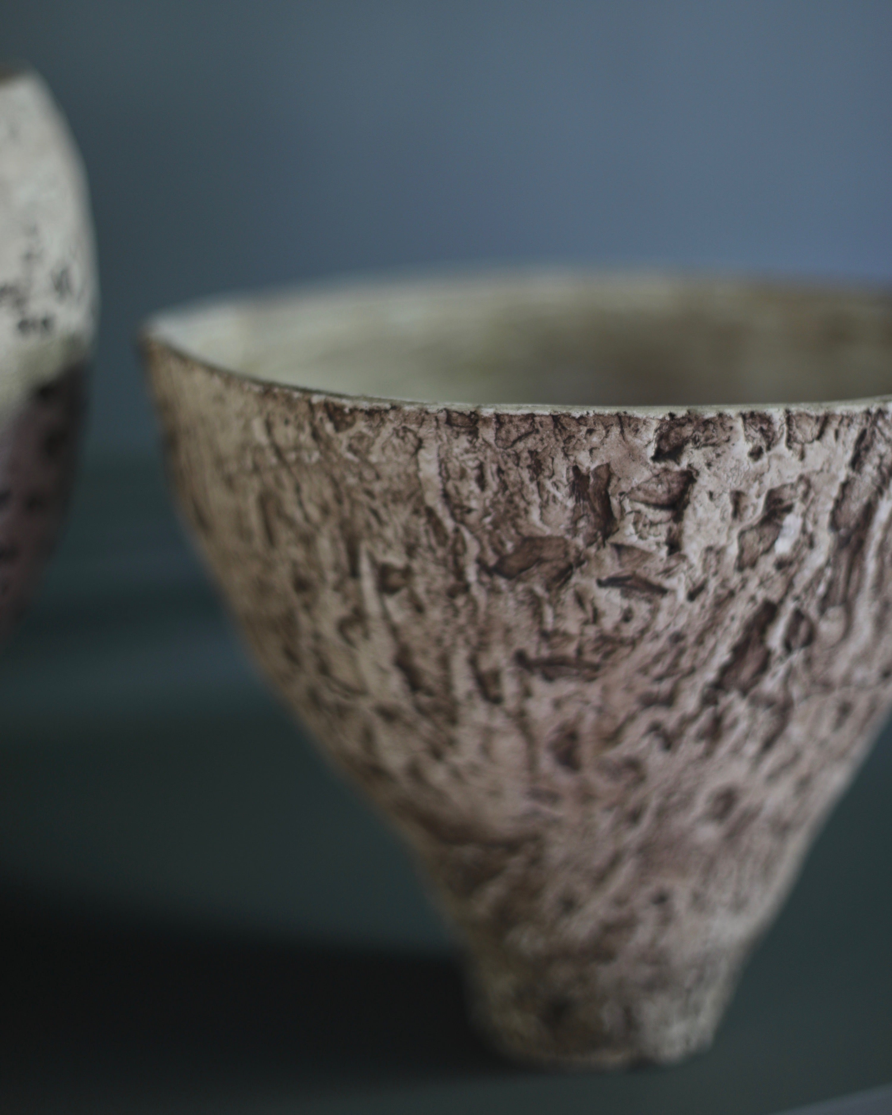 This vessel, adorned with the imprint of tree bark from the artist’s garden, celebrates organic forms and the natural world. Possessing an organic form that extends to a large opening, this vessel echoes something both ancient and constant, inspiring stillness and appreciation for our own personal connections with the environment.