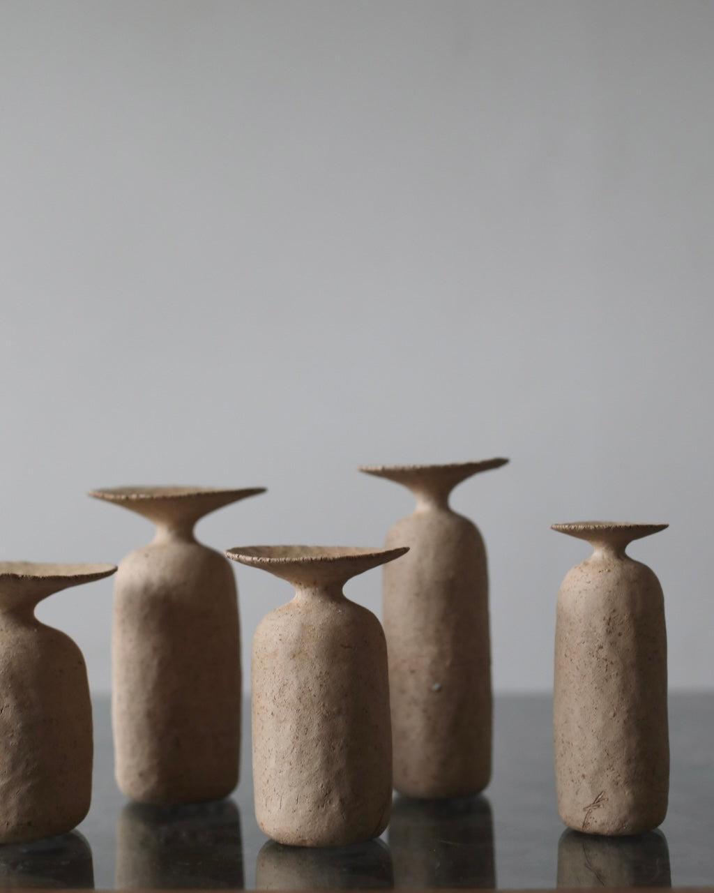 Takada Kae’s ceramic collection is shaped through a fully hand-built process, resulting in works with an organic, tactile presence and softly irregular surfaces. A restrained palette of earthy greens, browns, blues, and dusty creams unifies the group. The collection moves between precise geometric forms, defined by clean openings and architectural angles, and more rounded, enclosed shapes that feel pod-like and weathered, evoking objects shaped by time and nature.