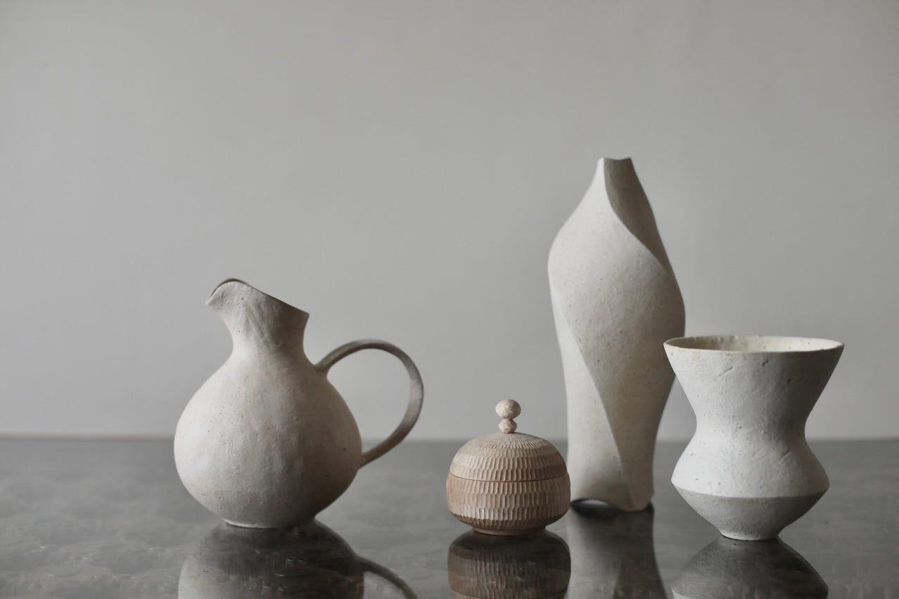 Takada Kae’s ceramic collection is shaped through a fully hand-built process, resulting in works with an organic, tactile presence and softly irregular surfaces. A restrained palette of earthy greens, browns, blues, and dusty creams unifies the group. The collection moves between precise geometric forms, defined by clean openings and architectural angles, and more rounded, enclosed shapes that feel pod-like and weathered, evoking objects shaped by time and nature.