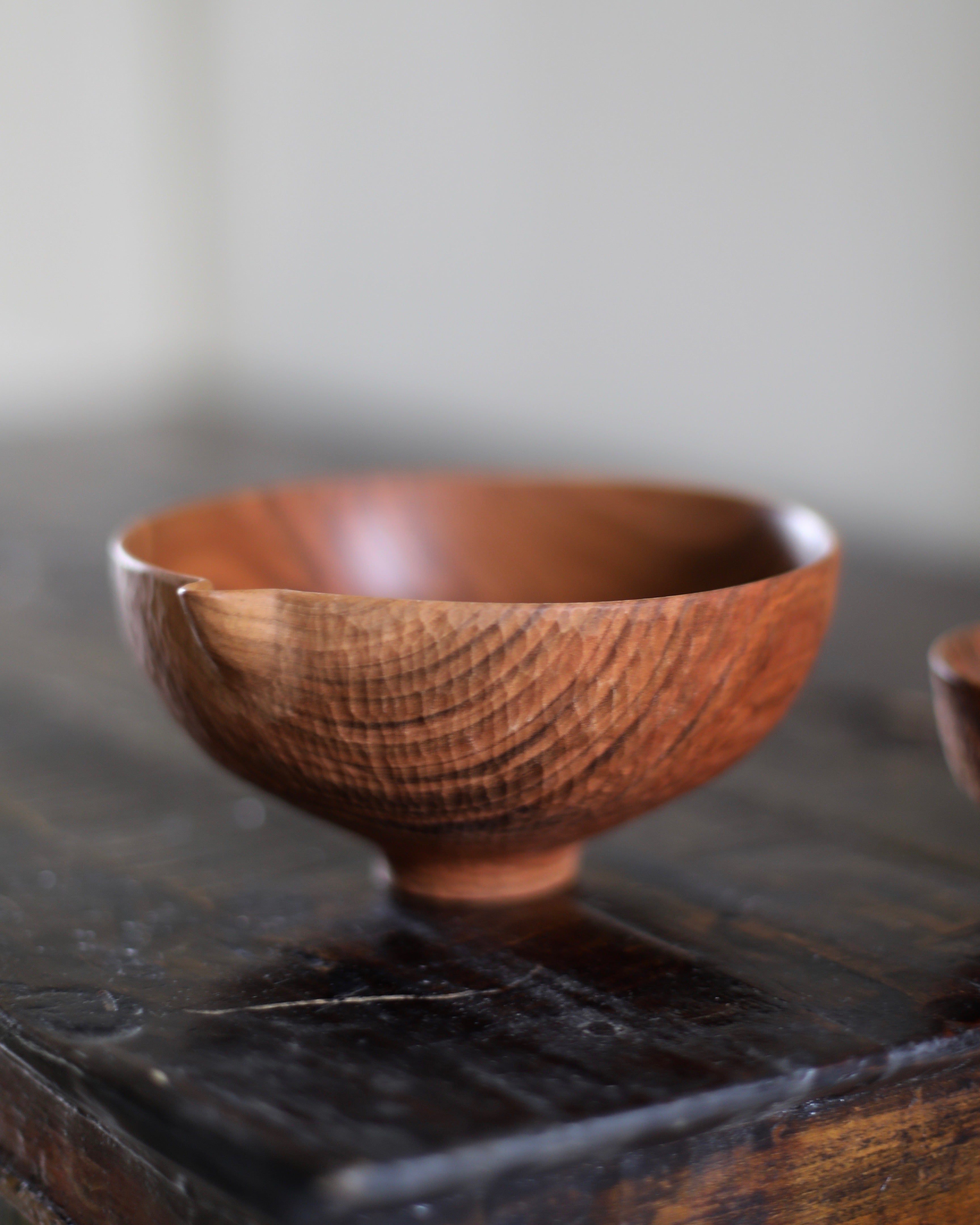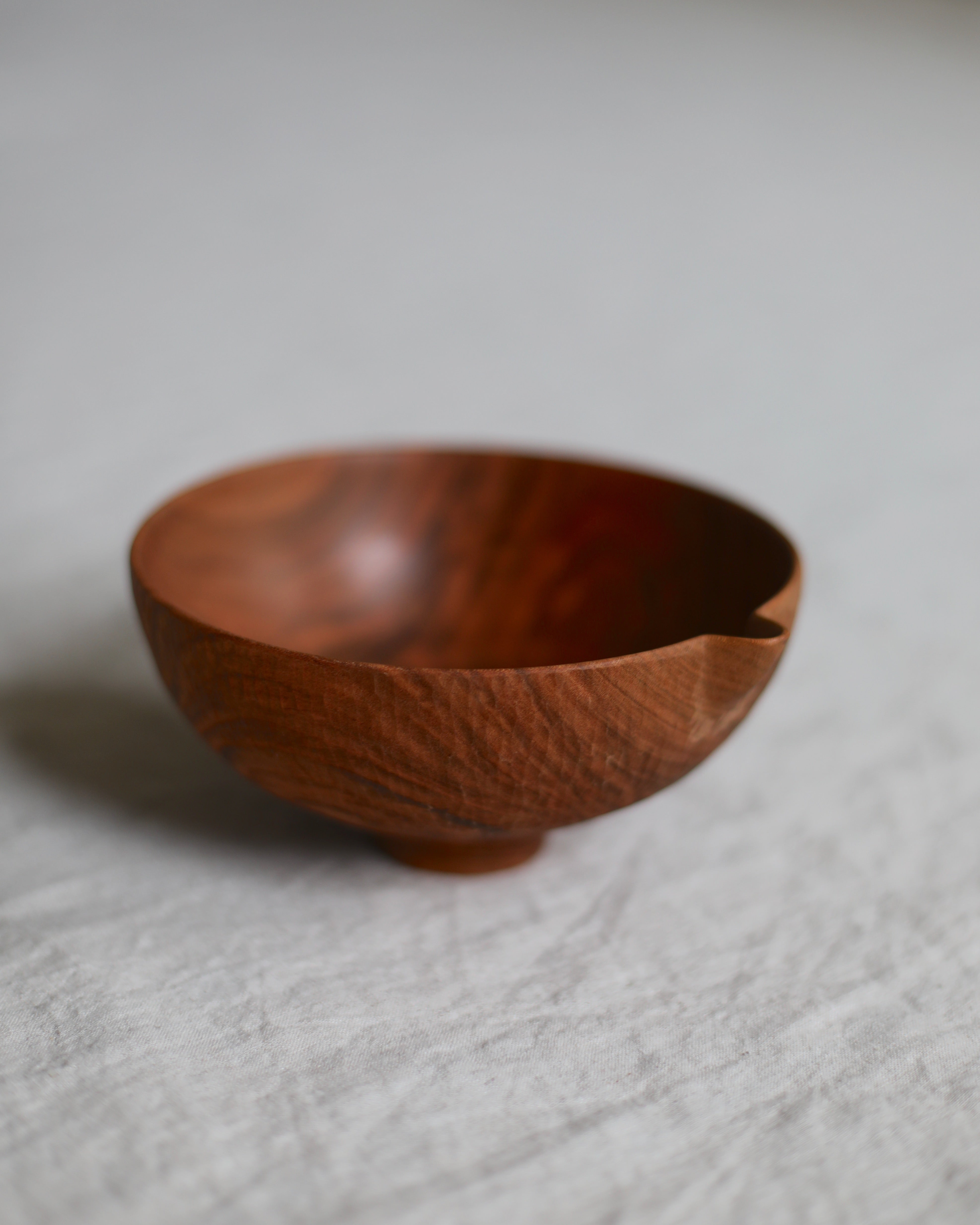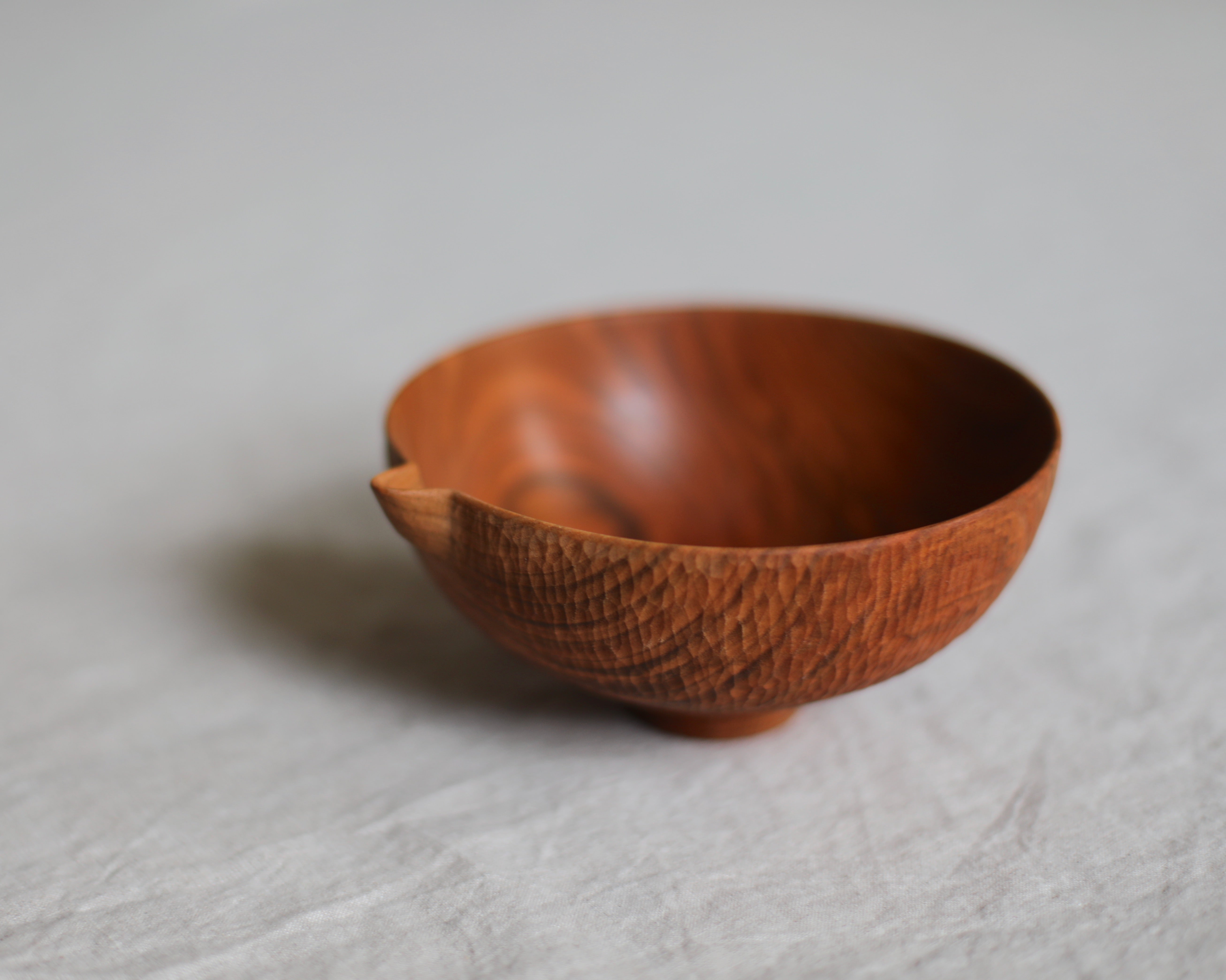A hand-turned ‘katakuchi’ made from cherry wood and finished with a ceramic finish. Here, Takahashi McGil balances the contemporary with tradition to create pieces that highlight the beauty in the natural character of the wood. Minimal in form, these traditional Japanese wares are texturally dynamic, contrasting a smooth interior with a subtly pinched surface.