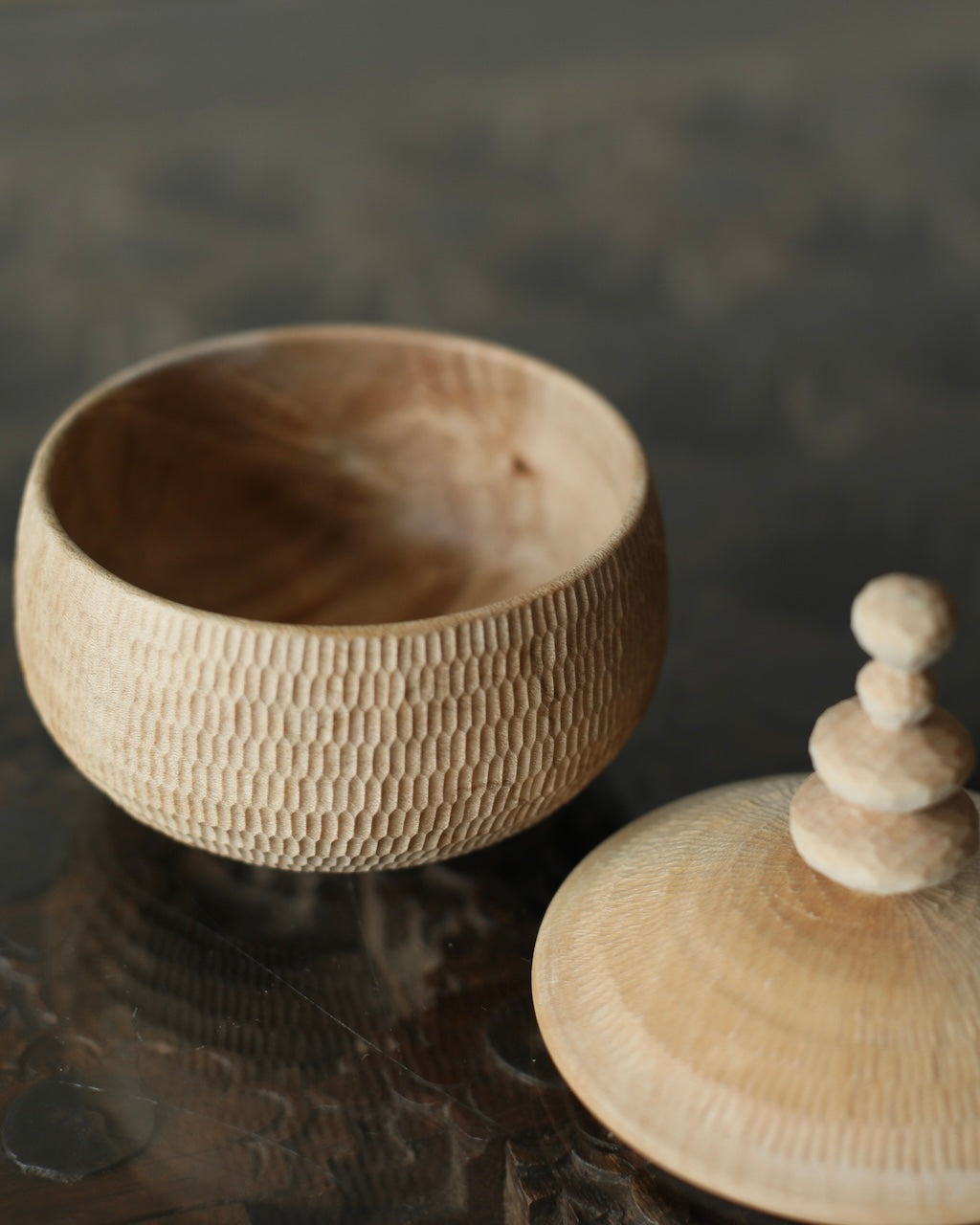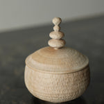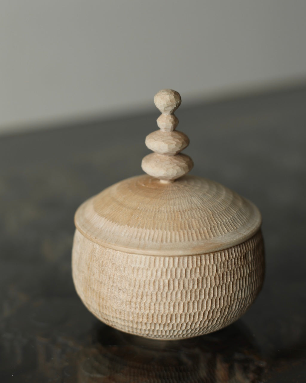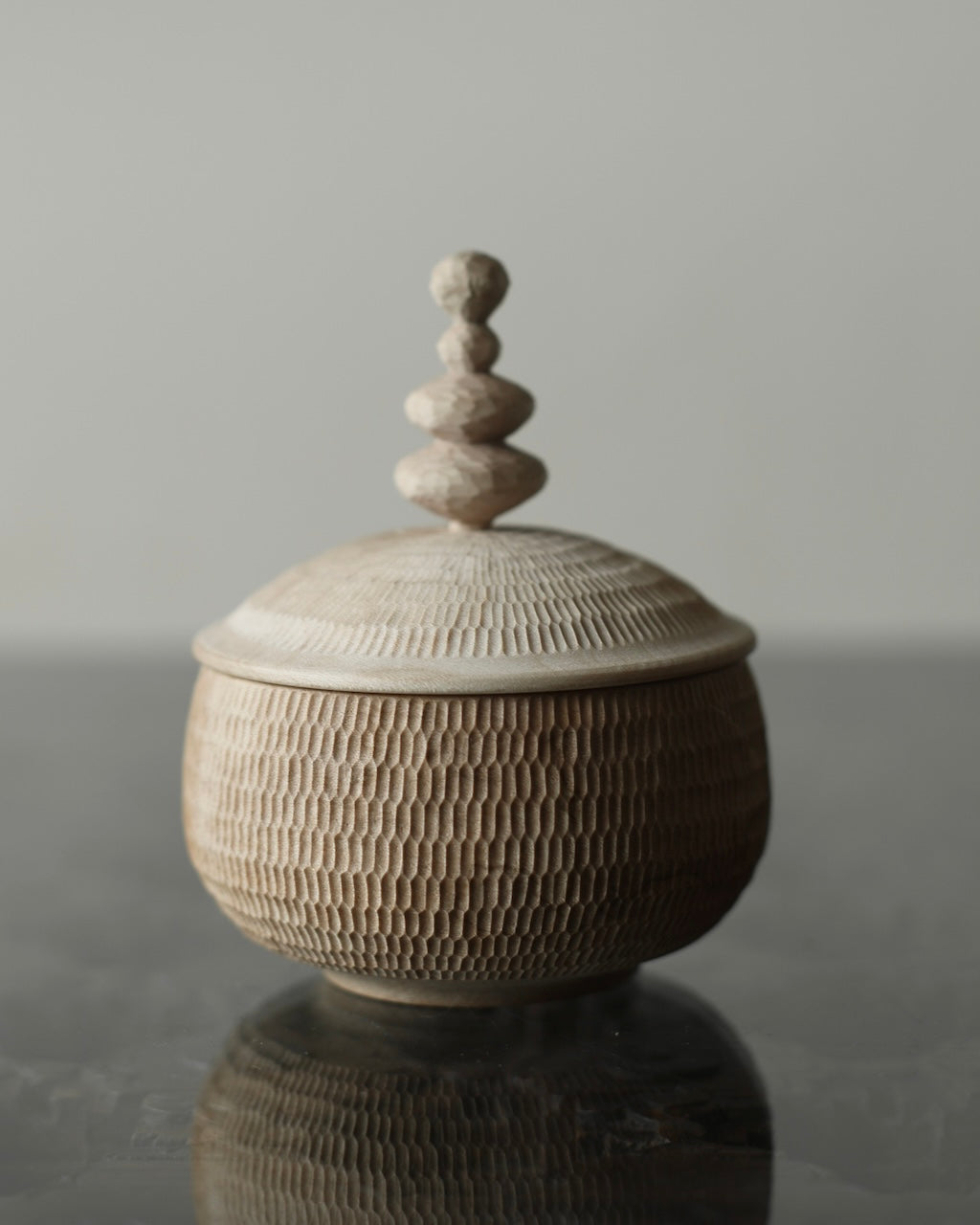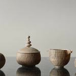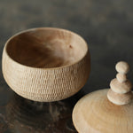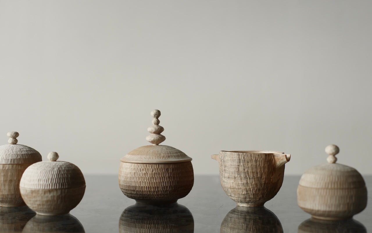 Takahashi McGil’s collection of sculptural vessels, containers, and spoons is crafted from locally sourced hardwoods including sycamore, cherry, ash, and beech. Drawing on both Japanese and Western traditions, the works feature carefully considered forms and distinctive surface finishes, with traditional materials such as tonoko, urushi, and jinoko used throughout. Fine rows of vertical notches introduce rhythm and tactility, while natural characteristics of the wood, knots, grain variation, and subtle cracks, are intentionally preserved, making each piece quietly individual.