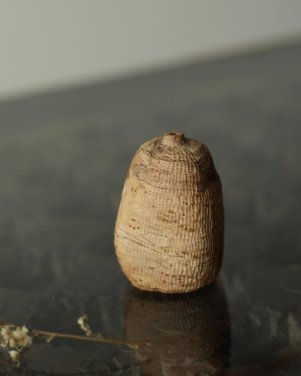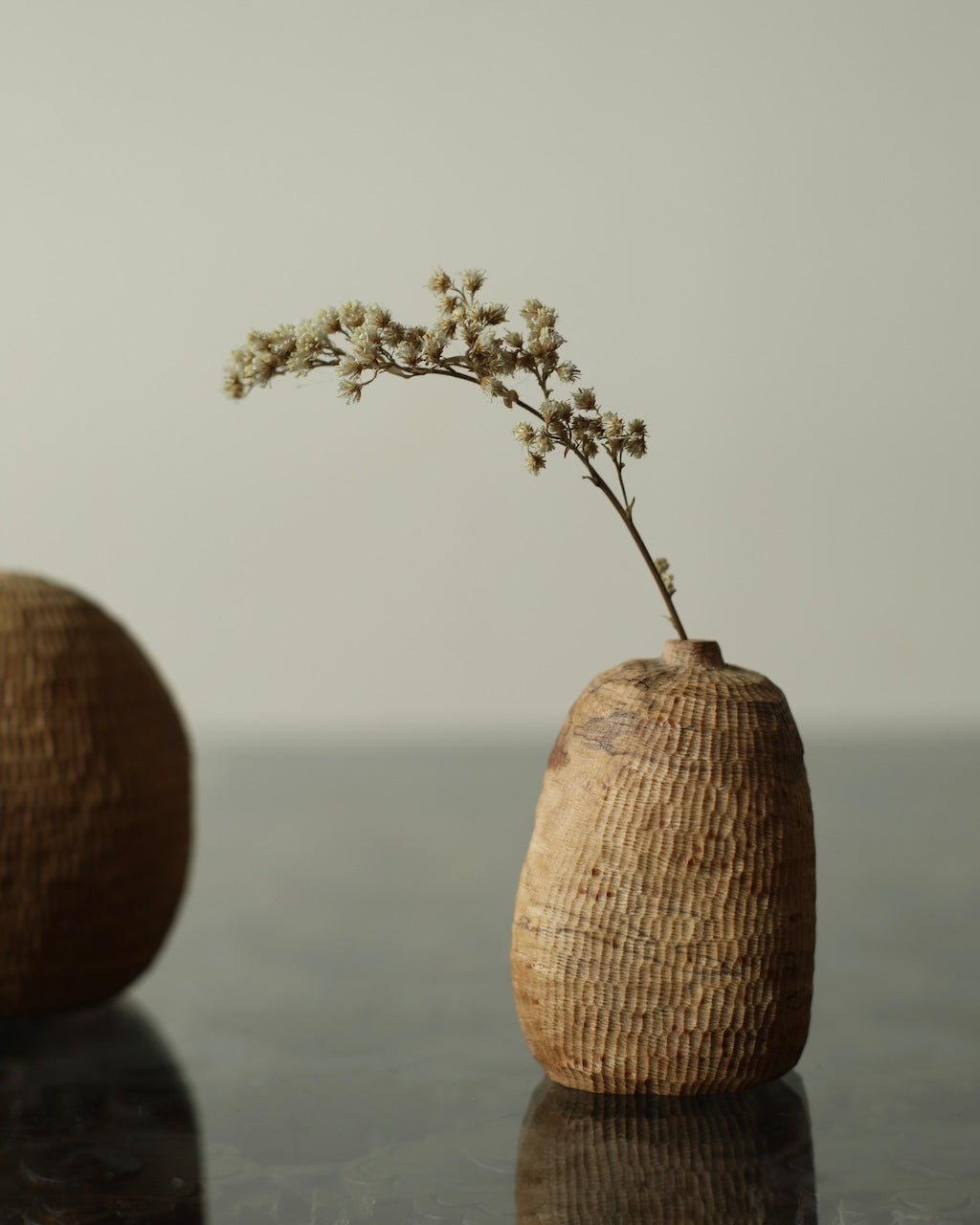 Takahashi McGil’s collection of sculptural vessels, containers, and spoons is crafted from locally sourced hardwoods including sycamore, cherry, ash, and beech. Drawing on both Japanese and Western traditions, the works feature carefully considered forms and distinctive surface finishes, with traditional materials such as tonoko, urushi, and jinoko used throughout. Fine rows of vertical notches introduce rhythm and tactility, while natural characteristics of the wood, knots, grain variation, and subtle cracks, are intentionally preserved, making each piece quietly individual.
