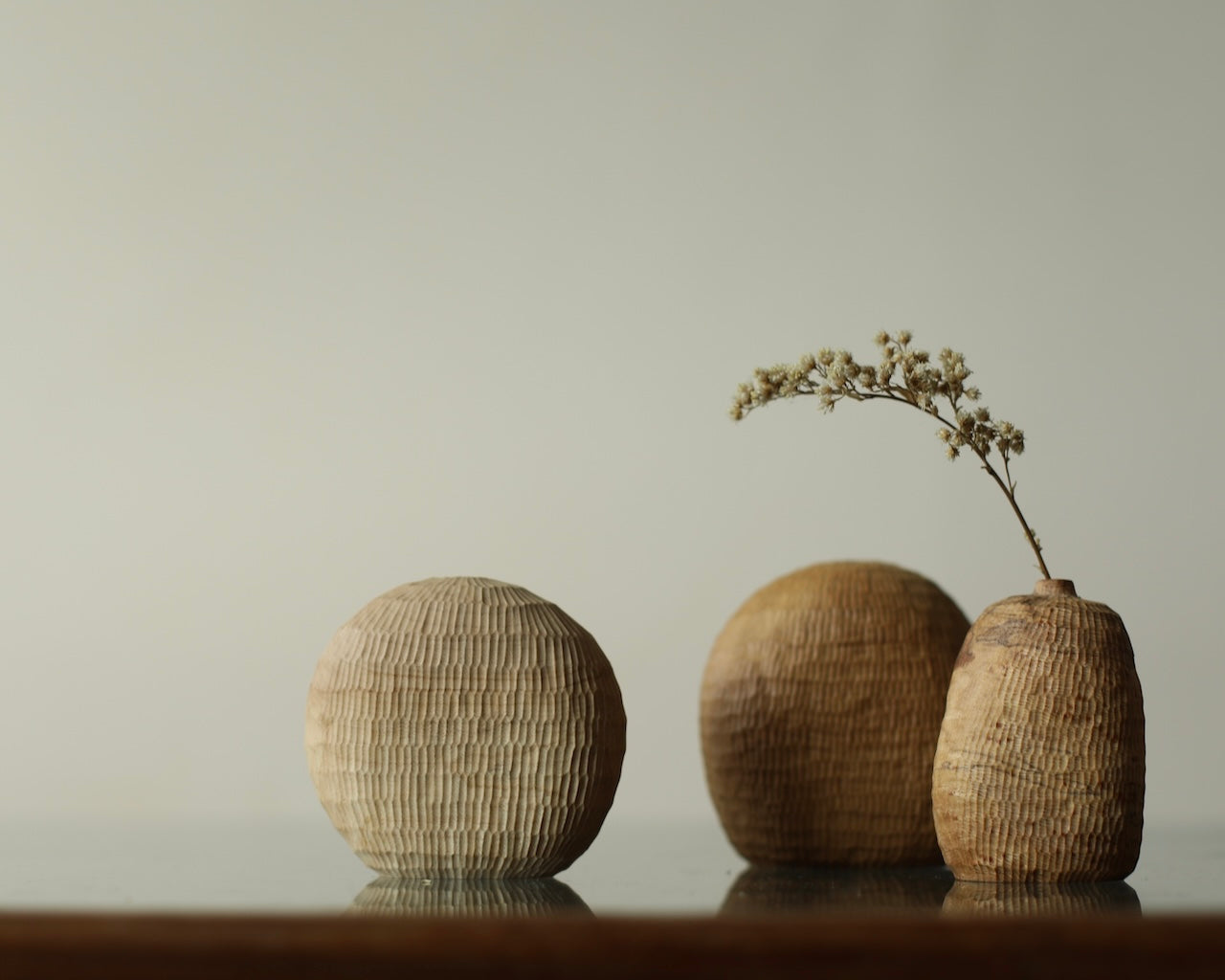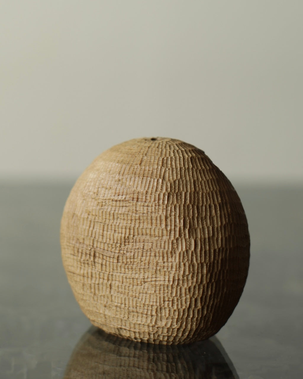 Takahashi McGil’s collection of sculptural vessels, containers, and spoons is crafted from locally sourced hardwoods including sycamore, cherry, ash, and beech. Drawing on both Japanese and Western traditions, the works feature carefully considered forms and distinctive surface finishes, with traditional materials such as tonoko, urushi, and jinoko used throughout. Fine rows of vertical notches introduce rhythm and tactility, while natural characteristics of the wood, knots, grain variation, and subtle cracks, are intentionally preserved, making each piece quietly individual.