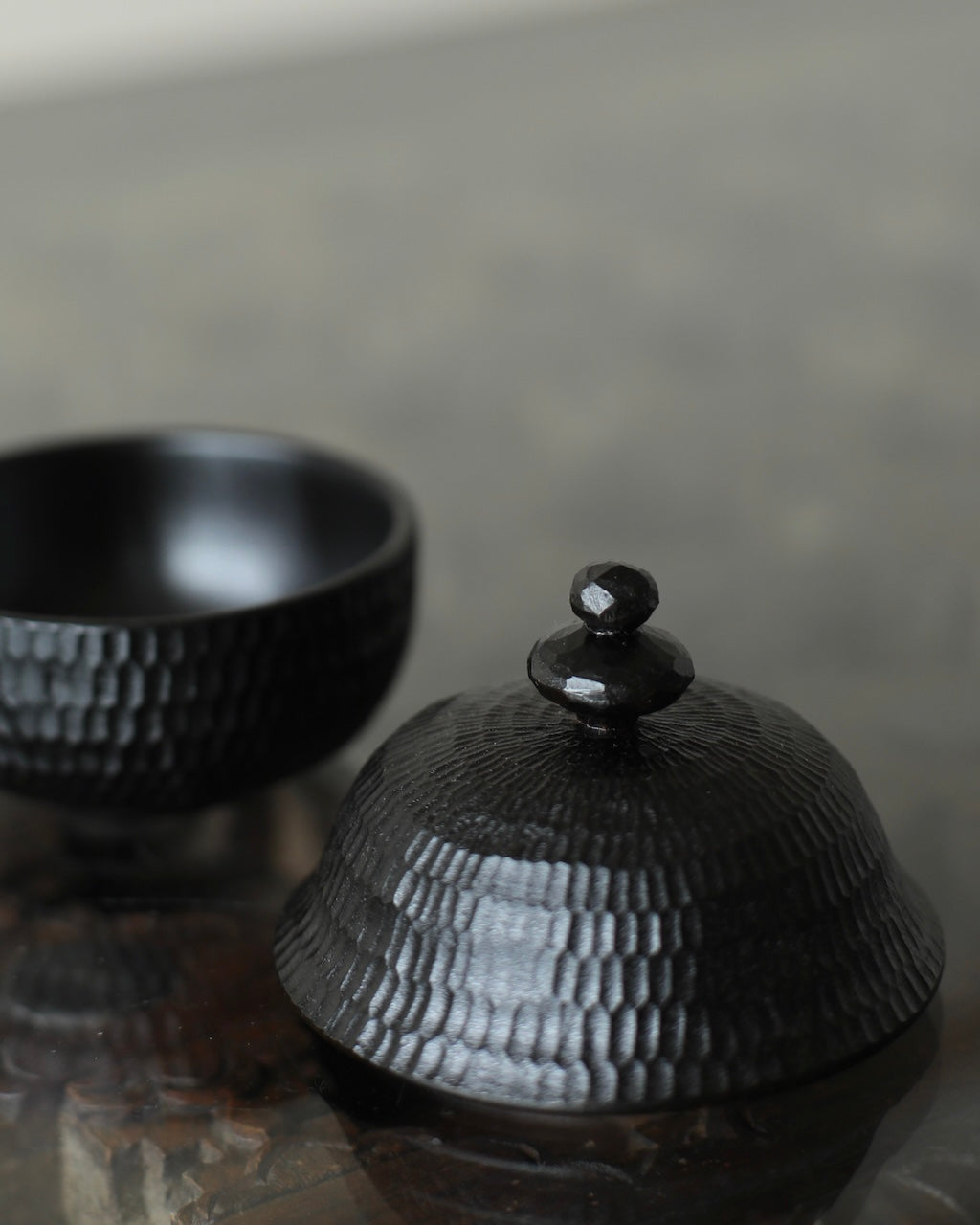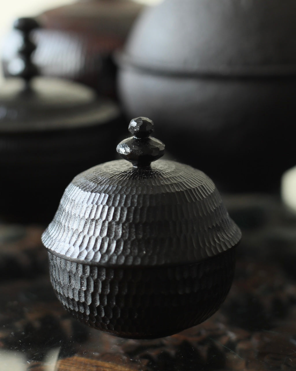 Takahashi McGil’s collection of sculptural vessels, containers, and spoons is crafted from locally sourced hardwoods including sycamore, cherry, ash, and beech. Drawing on both Japanese and Western traditions, the works feature carefully considered forms and distinctive surface finishes, with traditional materials such as tonoko, urushi, and jinoko used throughout. Fine rows of vertical notches introduce rhythm and tactility, while natural characteristics of the wood, knots, grain variation, and subtle cracks, are intentionally preserved, making each piece quietly individual.