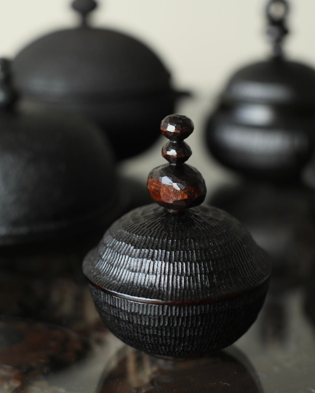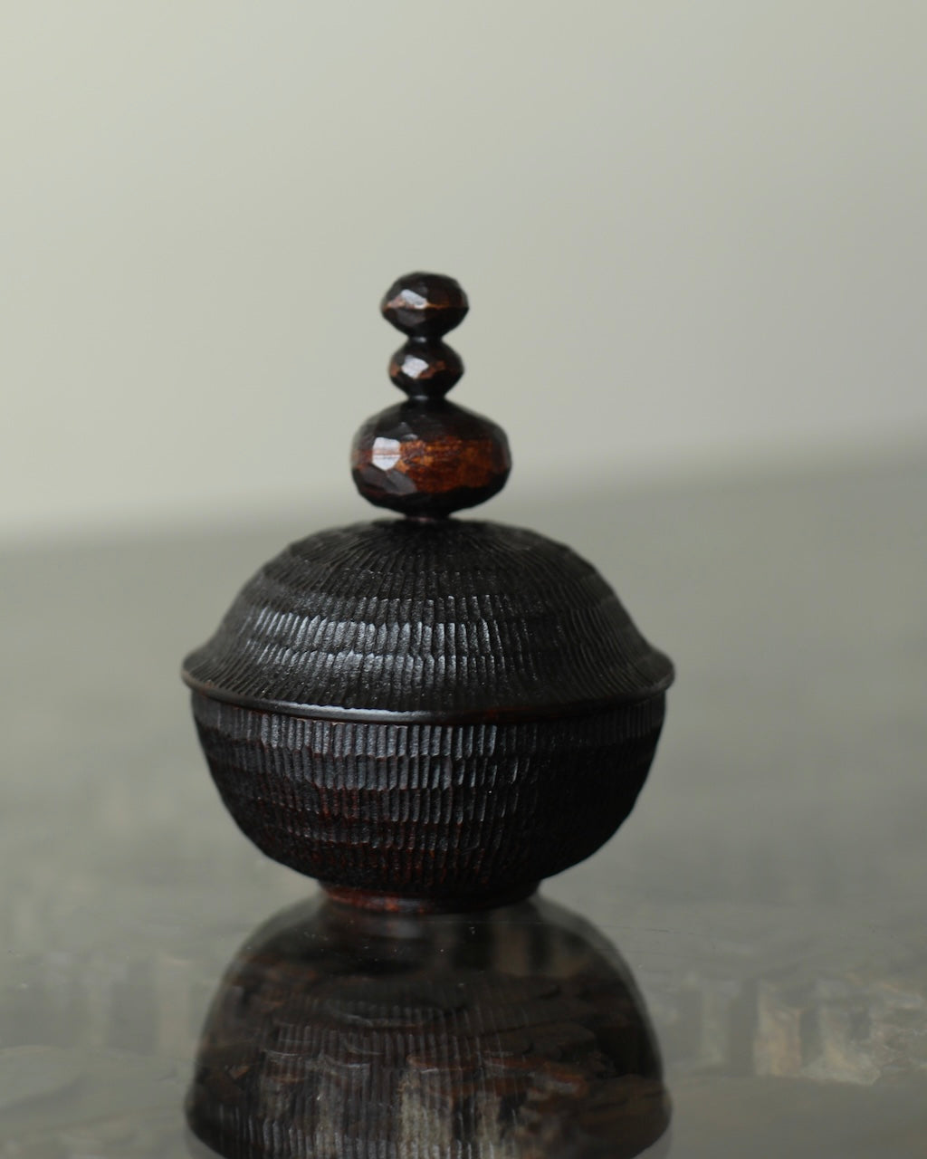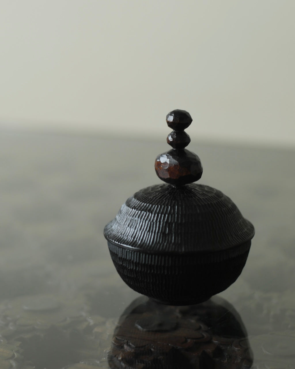 Takahashi McGil’s collection of sculptural vessels, containers, and spoons is crafted from locally sourced hardwoods including sycamore, cherry, ash, and beech. Drawing on both Japanese and Western traditions, the works feature carefully considered forms and distinctive surface finishes, with traditional materials such as tonoko, urushi, and jinoko used throughout. Fine rows of vertical notches introduce rhythm and tactility, while natural characteristics of the wood, knots, grain variation, and subtle cracks, are intentionally preserved, making each piece quietly individual.