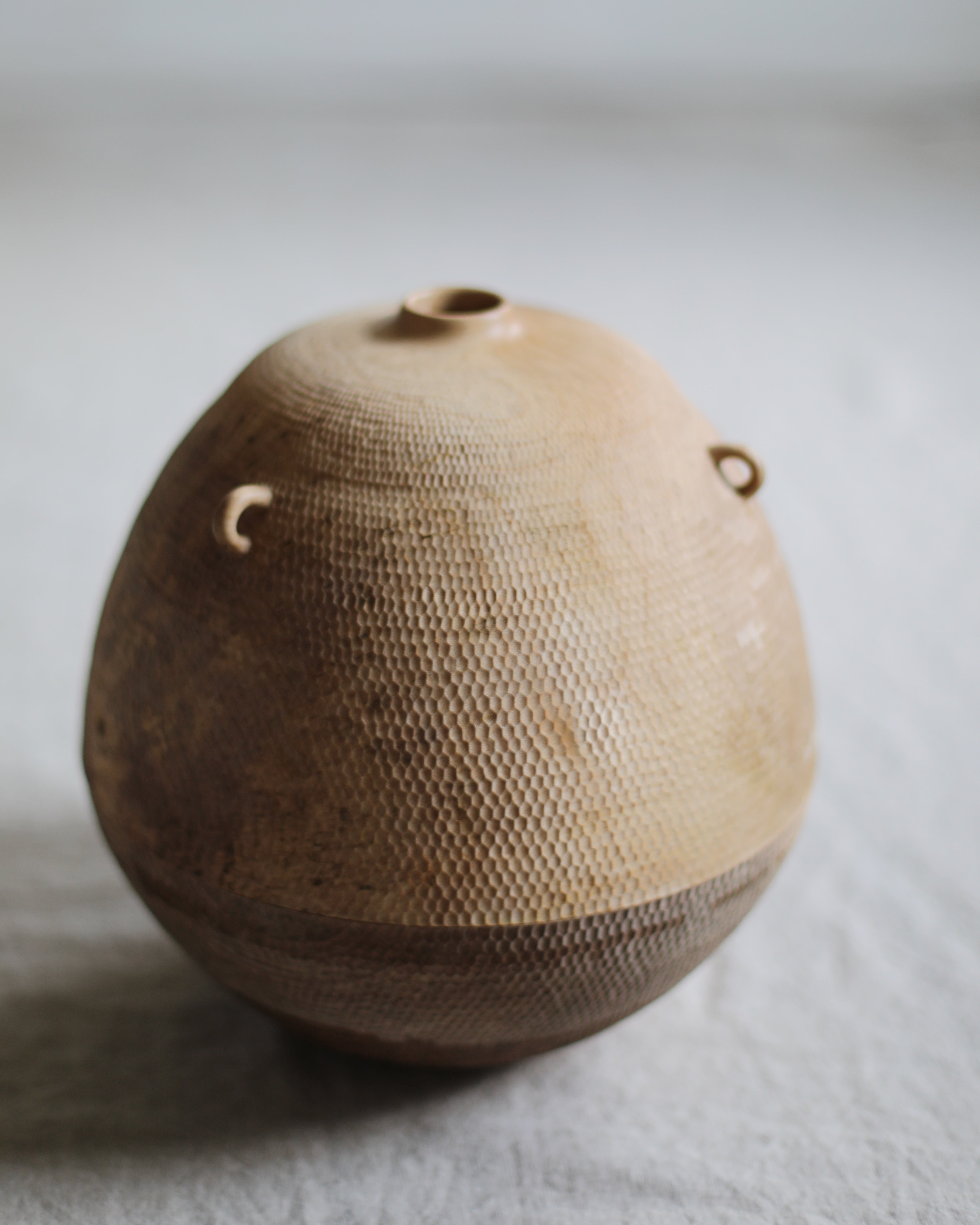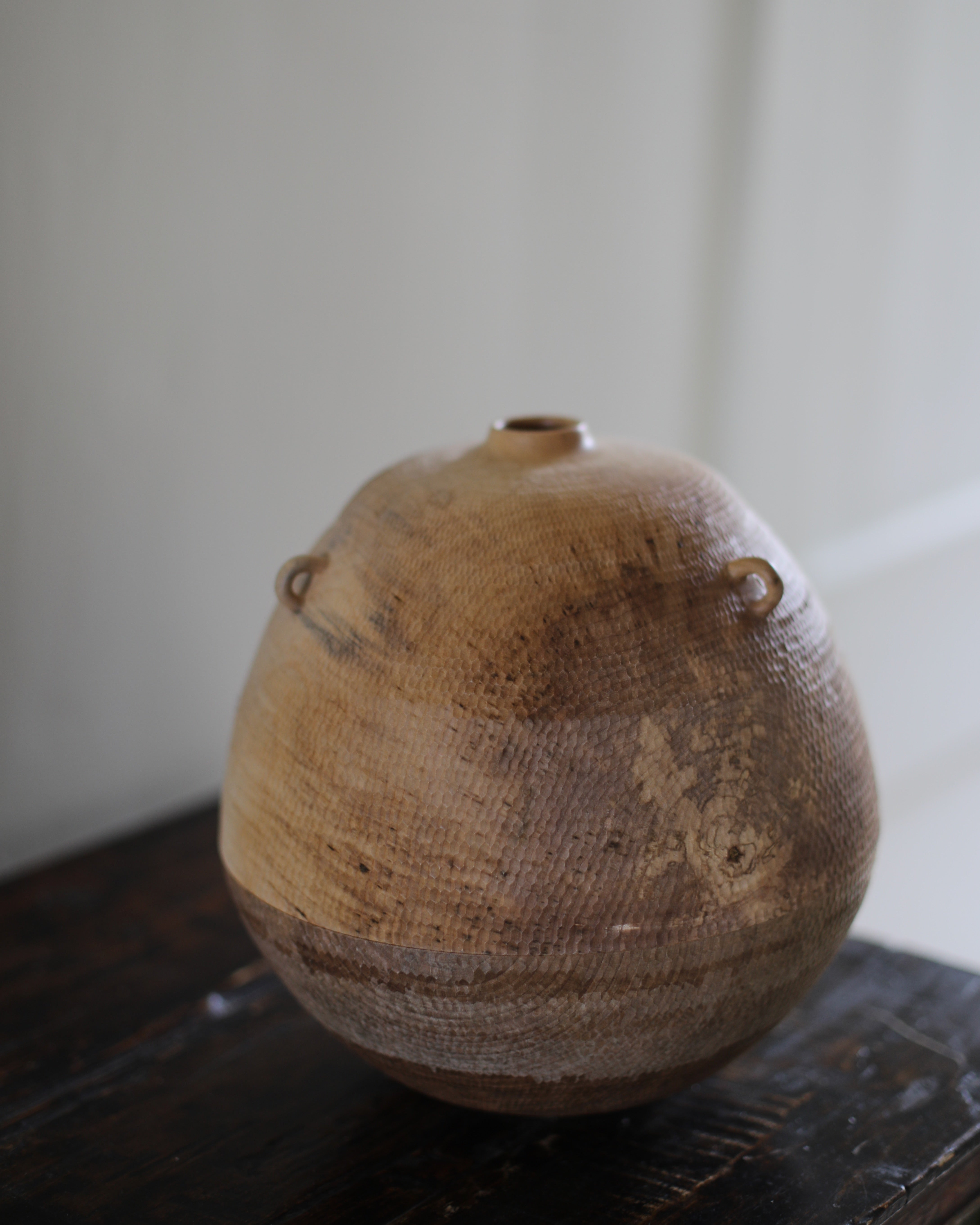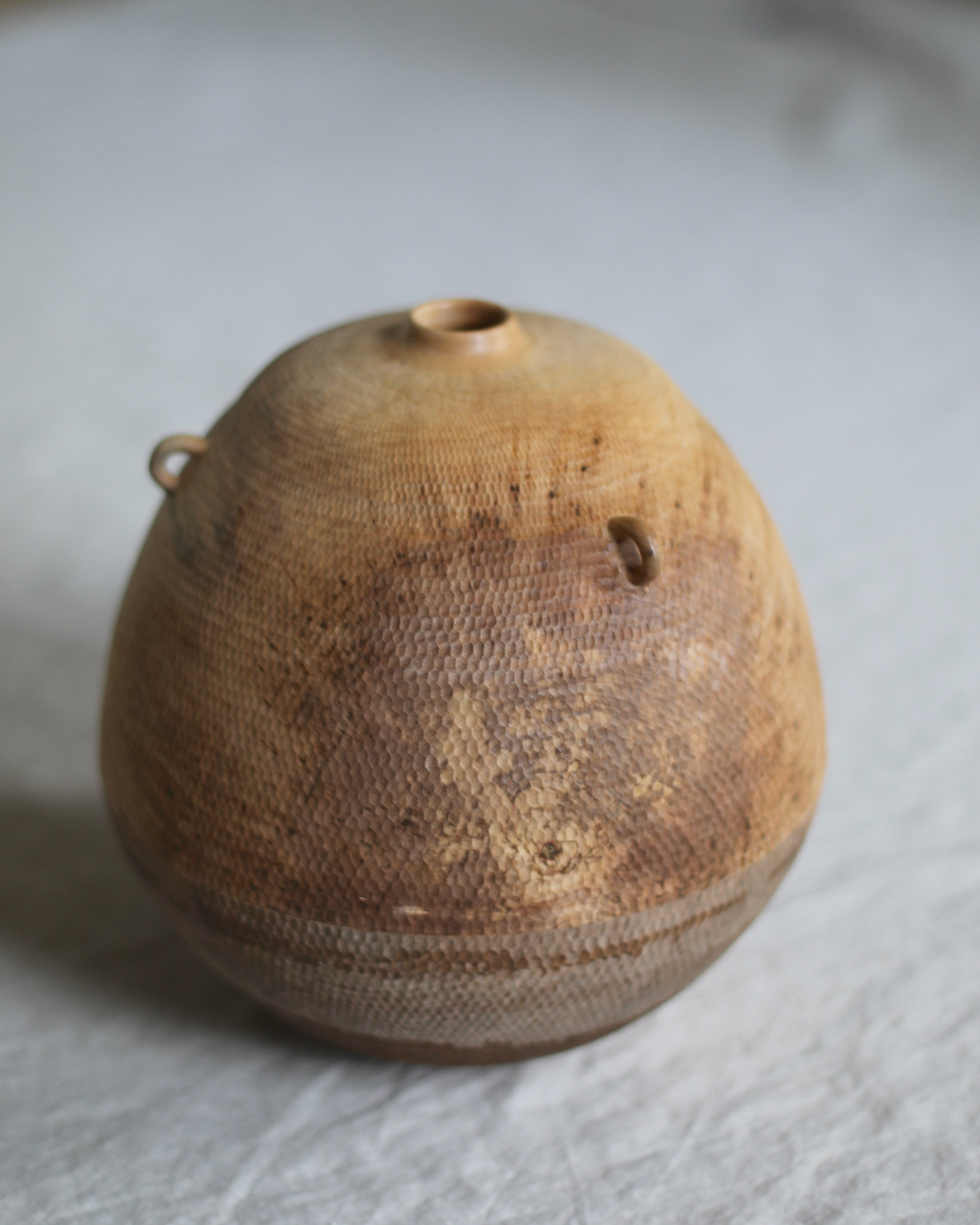 A hand-turned vessel with small handles and short neck made from sycamore wood and coated in a ceramic finish. Created through a collaborative process of woodturning and chiselling, Takahashi McGil balances the contemporary with tradition to create pieces that celebrate the beauty in the natural character of the wood. Dynamic in both texture and form, the pinched surface reveals a new beauty in the natural character of the wood.