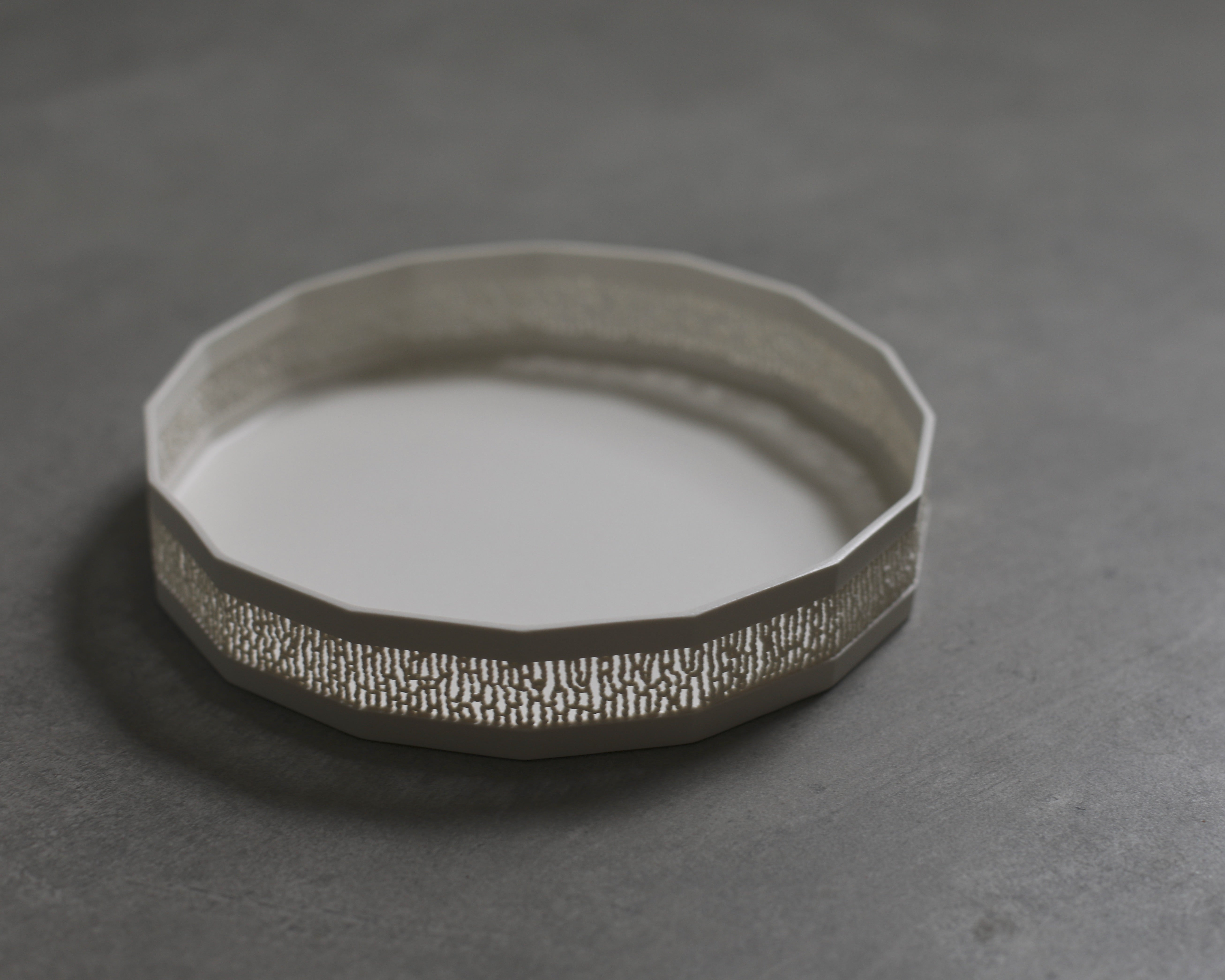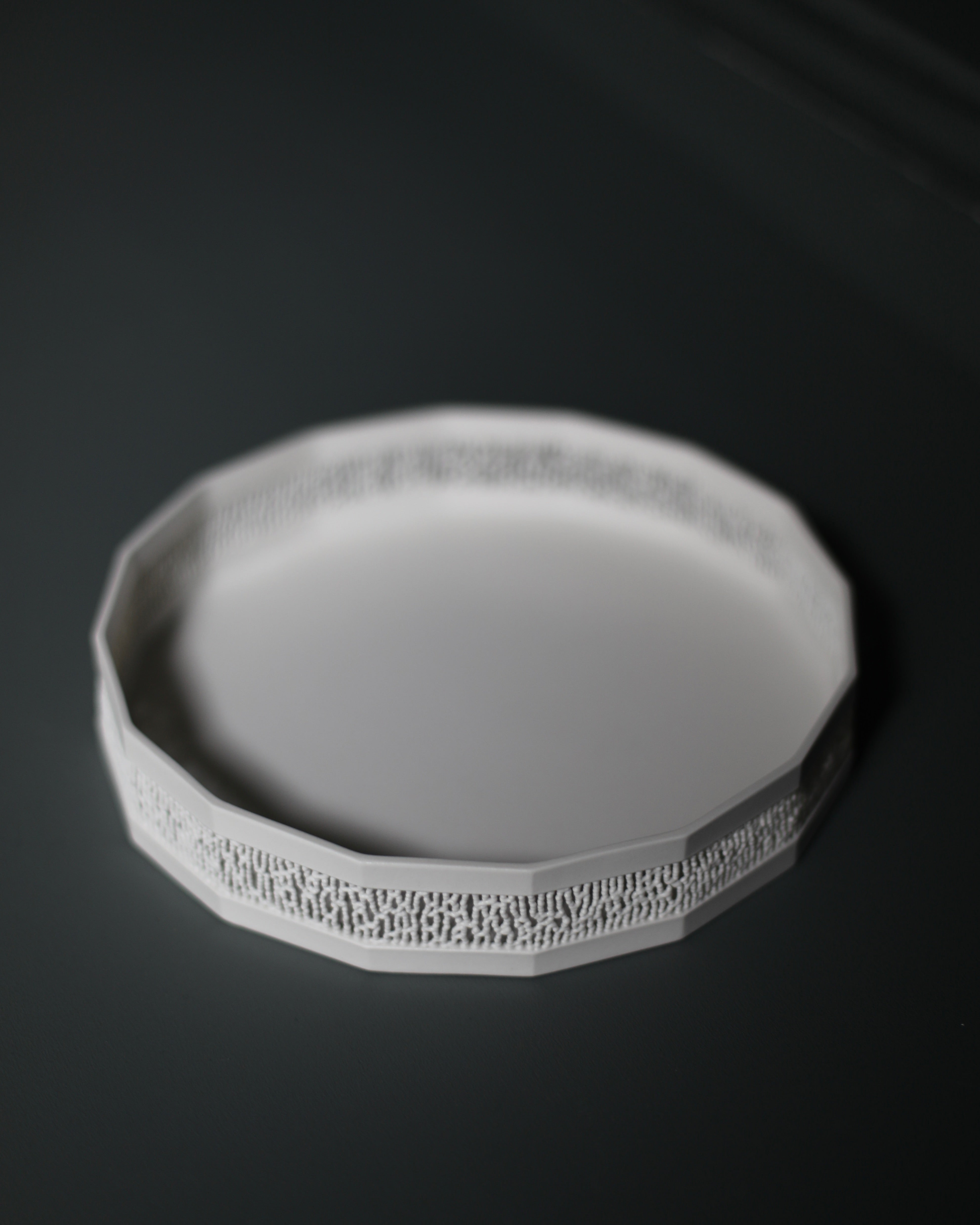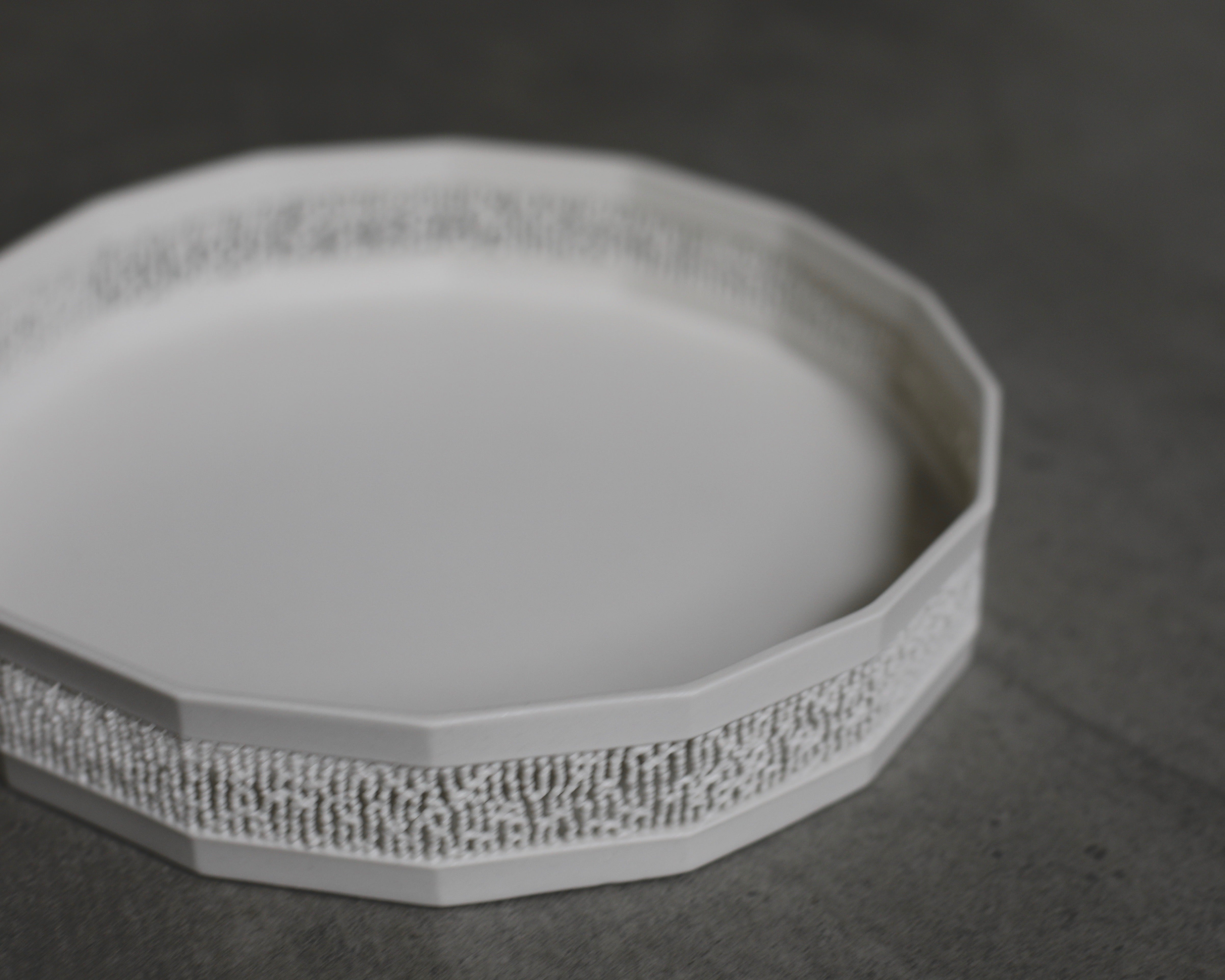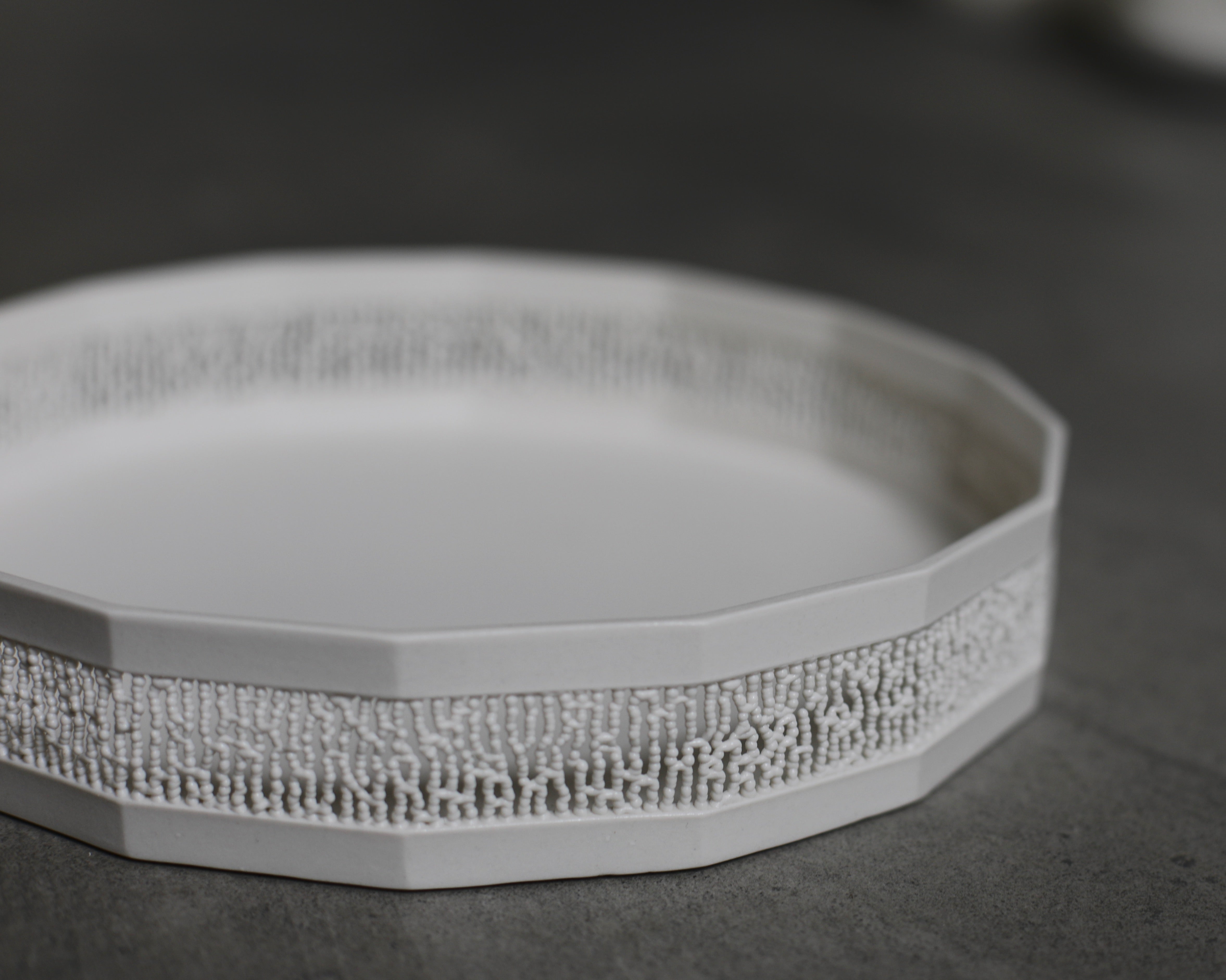 With sixteen sides, a smooth, silky texture, and a raised edge featuring Aoki's signature style of complex detailing, this porcelain plate in pure white perfectly balances simplicity with intricacy. To create his pieces, Aoki squeezes the slightly hard slurry into granules, connects them like a net, and shapes them into cylinders and cones, creating a delicate style of white porcelain that highlights a sense of both strength and fragility.