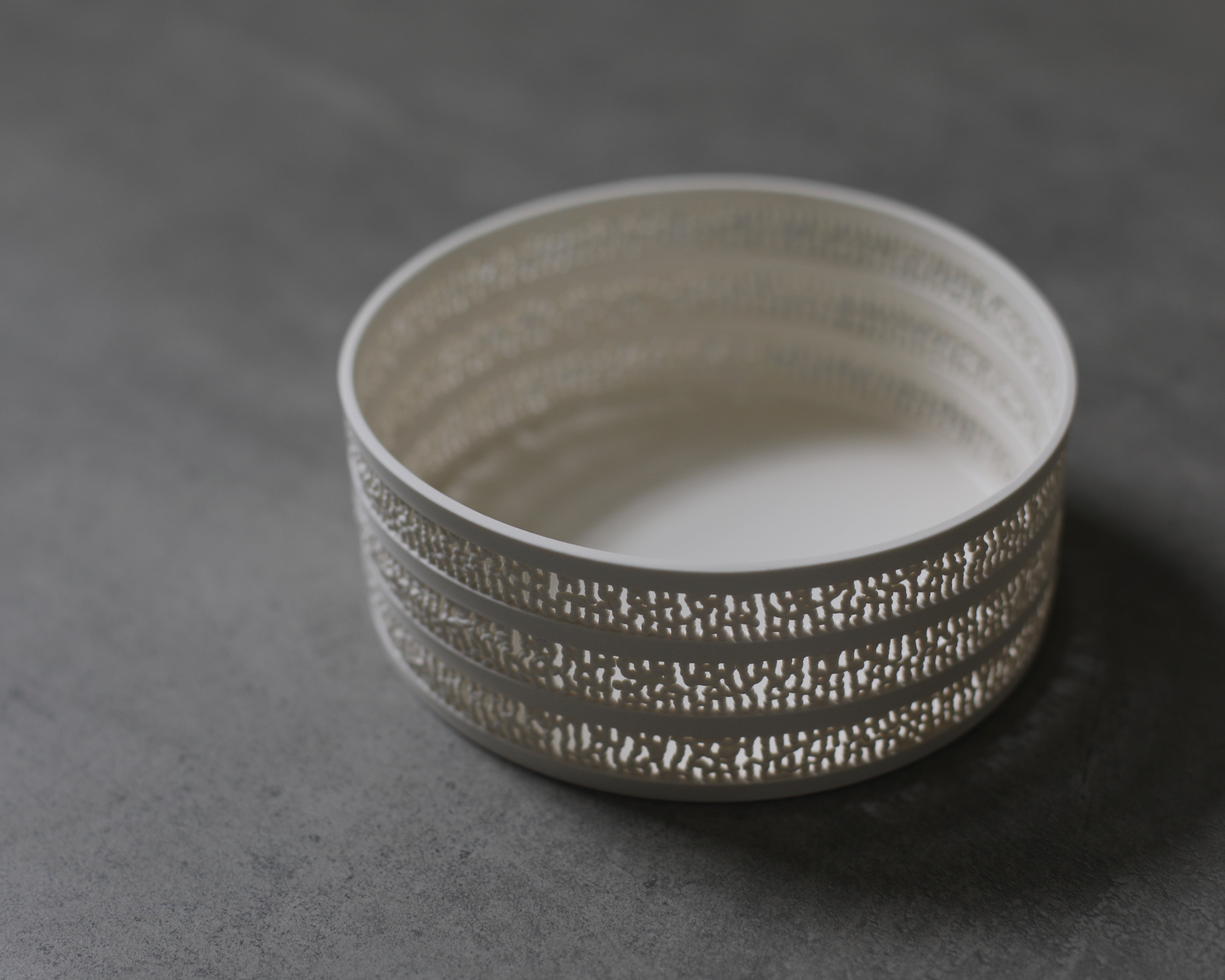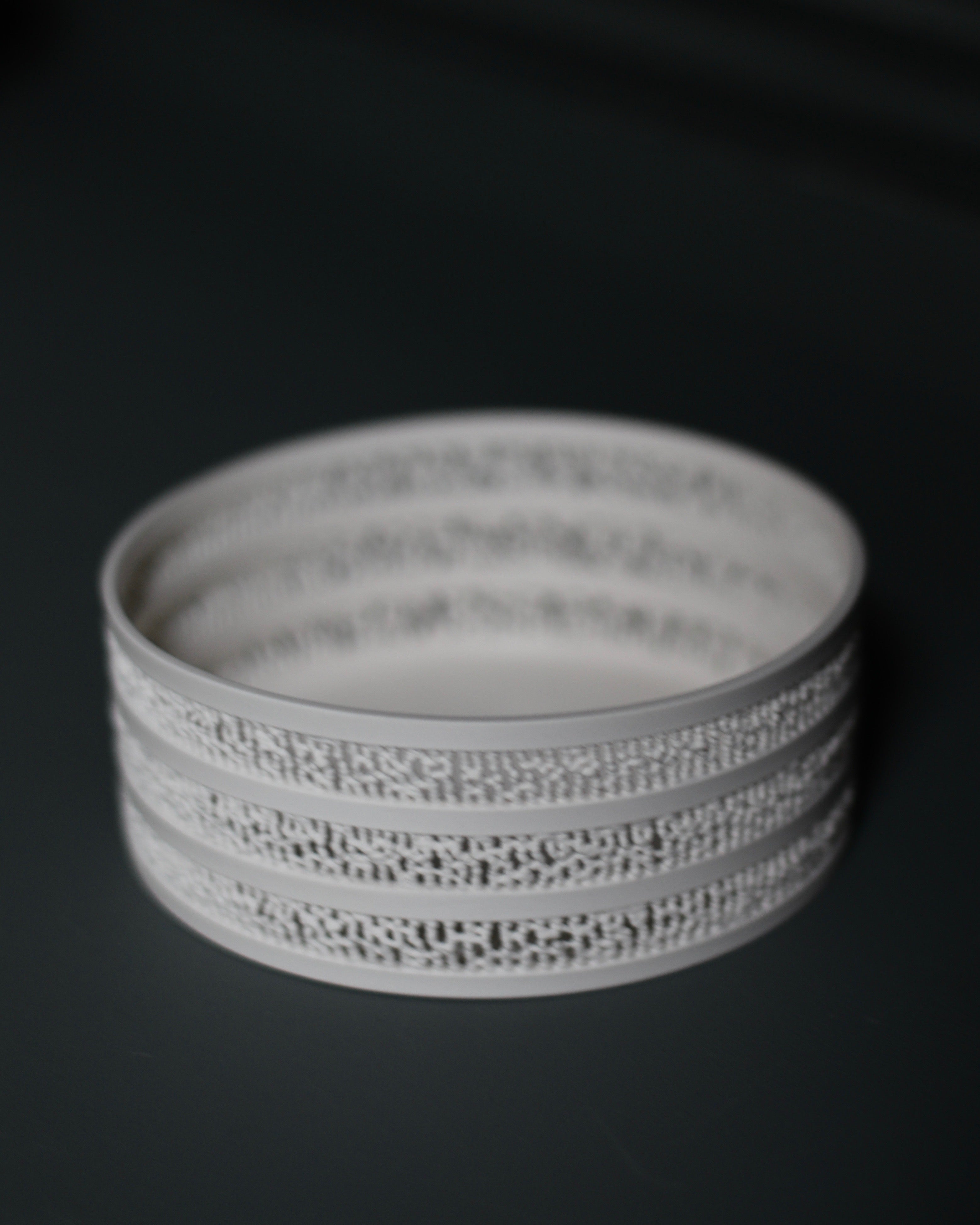 This porcelain vessel in pure white has a smooth, silky texture and a tiered body that features Aoki's signature style of intricate detailing. To create his pieces, Aoki squeezes the slightly hard slurry into granules, connects them like a net, and shapes them into cylinders and cones, creating a delicate style of white porcelain that highlights a sense of both strength and fragility.