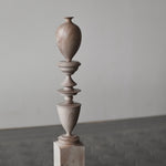 Ichikawa’s collection of wooden vessels and vases showcases an extraordinarily wide range of species, often highlighting spalted or richly figured timber that guides each form. Many pieces include carved stands, from simple to decorative, designed as functional complements. While mainly consisting of a perfectly smooth, polished finish, natural features such as grain, colour variation, and texture, are preserved and balanced with precise craftsmanship, giving each work a distinct presence while celebrating the character of the wood.