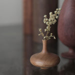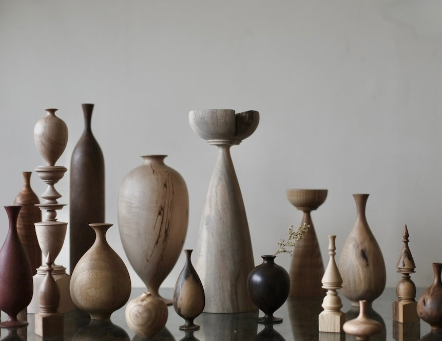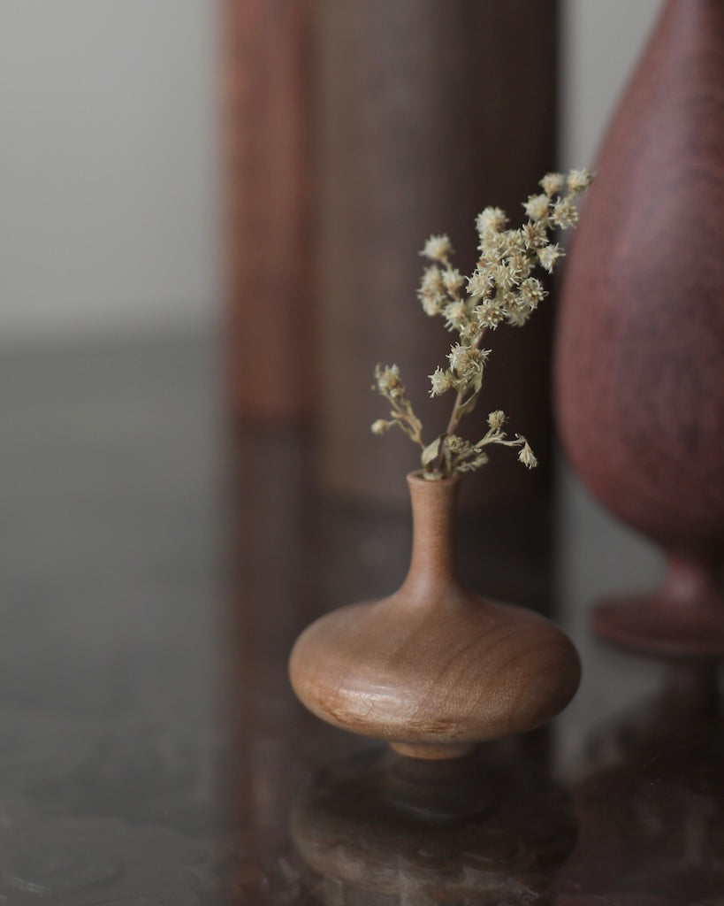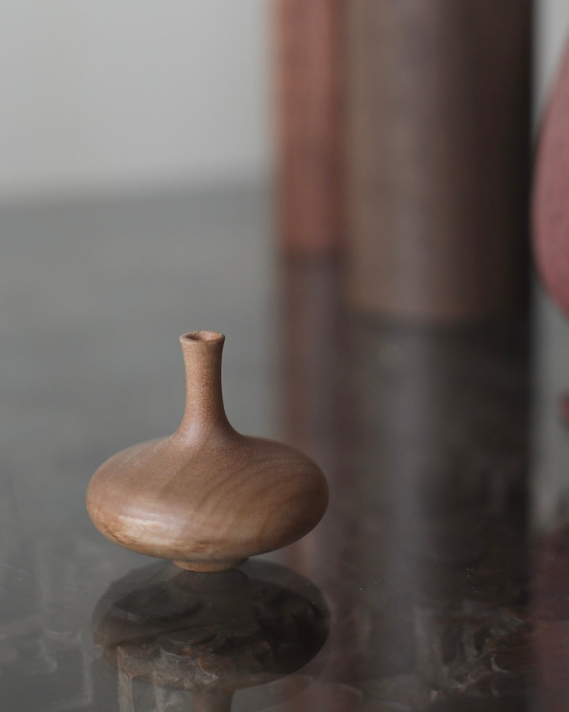 Ichikawa is known for vessels and vases that celebrate the natural character of wood: grain, tonal variation, and gradual transformation over time. He works with a wide range of species, often selecting spalted or richly figured woods, allowing the grain to guide the form and atmosphere of each piece.