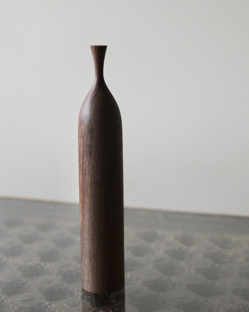 Ichikawa is known for vessels and vases that celebrate the natural character of wood: grain, tonal variation, and gradual transformation over time. He works with a wide range of species, often selecting spalted or richly figured woods, allowing the grain to guide the form and atmosphere of each piece.
