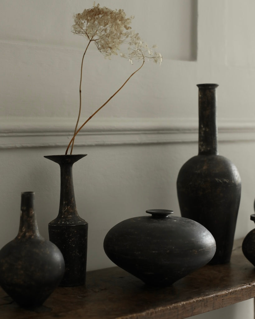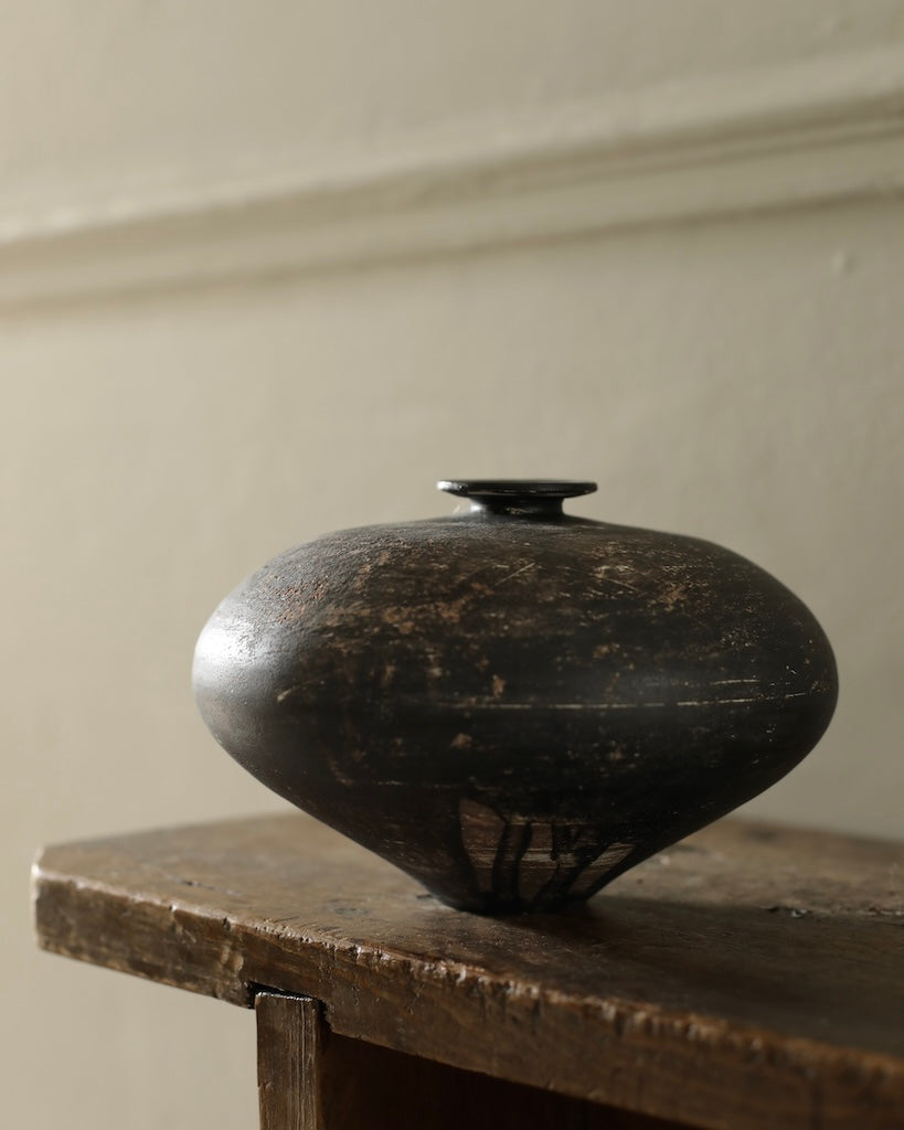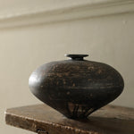 Description: A squat, rounded vase with a narrow opening and flat rim. Thrown on the wheel, its height is reimagined in width, resulting in a broad, grounded form. Finished in Ozawa’s distinctive manner, the surface is brushed with a mixture of dark blacks and natural tones.