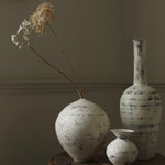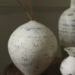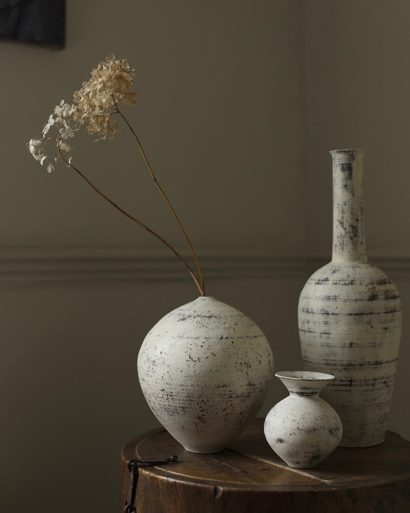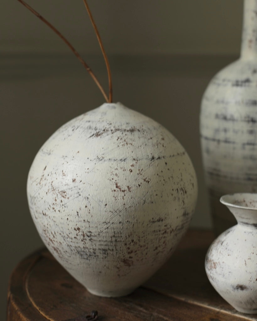 Description: A rounded form with a small opening at the top. The surface is softly brushed with a cream glaze, revealing traces of the clay beneath. Subtle markings and textured variations lend the piece a quiet presence. As with much of Ozawa’s work, the form remains open to interpretation.