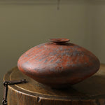 Description: A squat, rounded vase with a narrow opening and flat rim. Thrown on the wheel, its height is reimagined in width, resulting in a broad, grounded form. Finished in Ozawa’s distinctive manner, the surface is brushed with a deep umber-orange glaze that reveals the dark clay beneath.