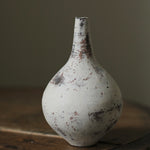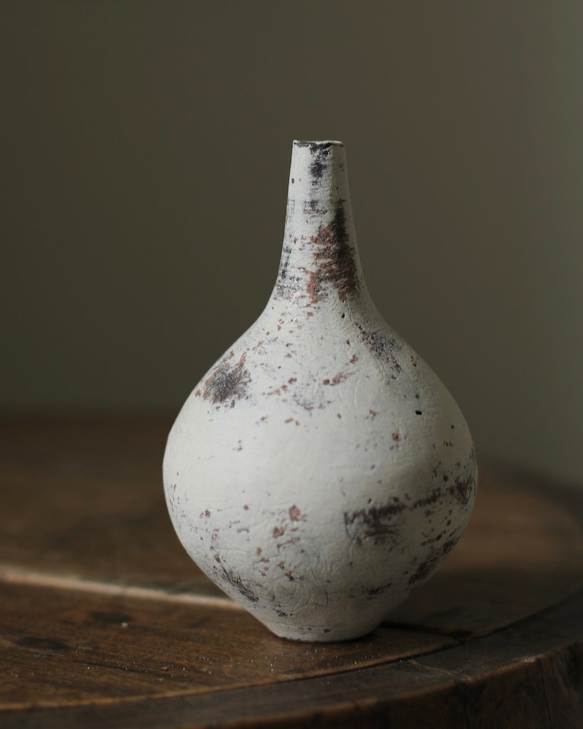 Description: A small, upright vessel with a narrow base that rounds gently before tapering into a slender neck. The surface is brushed with a soft cream glaze, allowing glimpses of the underlying clay to emerge. Loose markings and a roughened texture bring quiet variation. As with much of Ozawa’s work, the form invites open interpretation in both use and meaning.