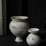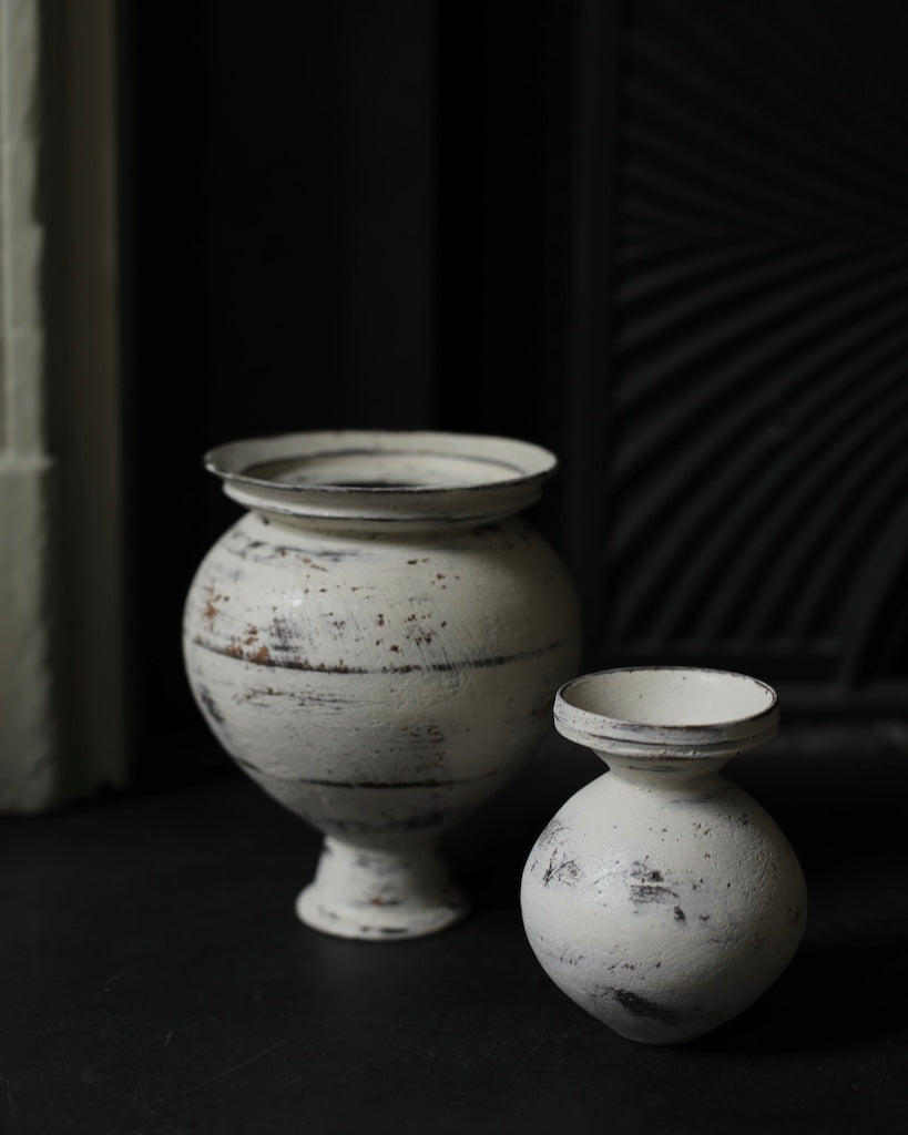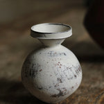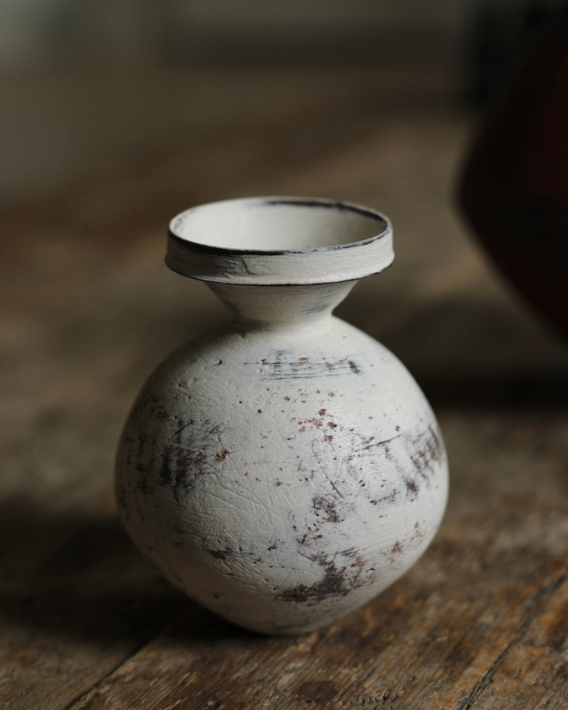 Description: A small vase with a rounded body rising from a narrow base and tapering in again toward a geometric rim. Finished in Ozawa’s distinctive manner, the surface is brushed with layered tones of cream and earthy neutrals, revealing subtle traces of the dark clay beneath.