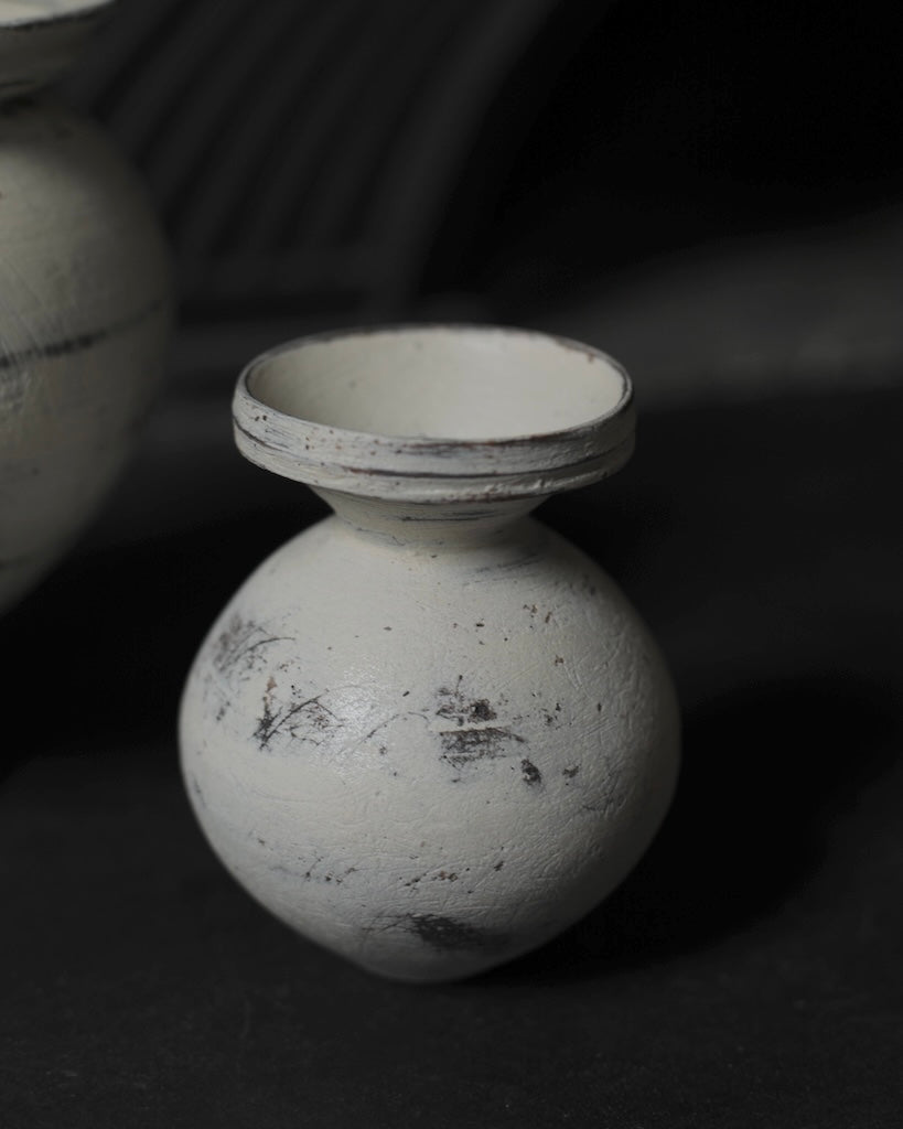 Description: A small vase with a rounded body rising from a narrow base and tapering in again toward a flared, ribbed rim. Finished in Ozawa’s distinctive manner, the surface is brushed with layered tones of cream and earthy neutrals, revealing subtle traces of the dark clay beneath.