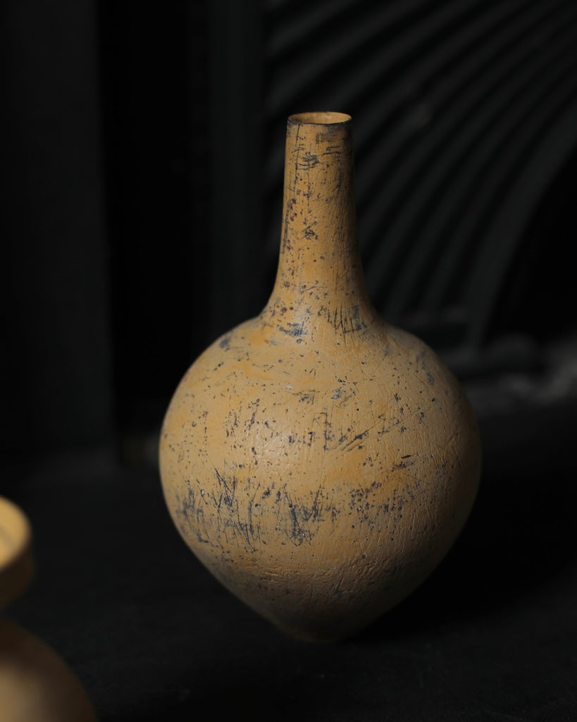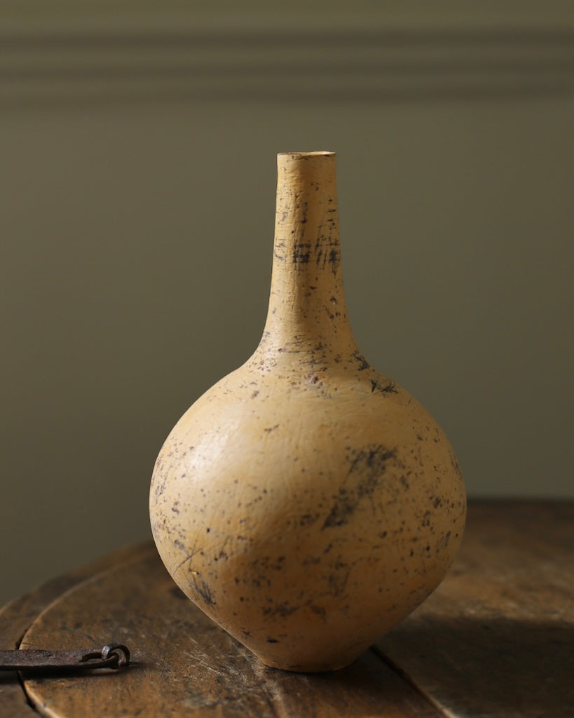 Description: A small vase with a rounded body rising from a narrow base and tapering in again toward a conical opening. Finished in Ozawa’s distinctive manner, the surface is brushed with layered tones of umber yellow and earthy neutrals, revealing subtle traces of the dark clay beneath.