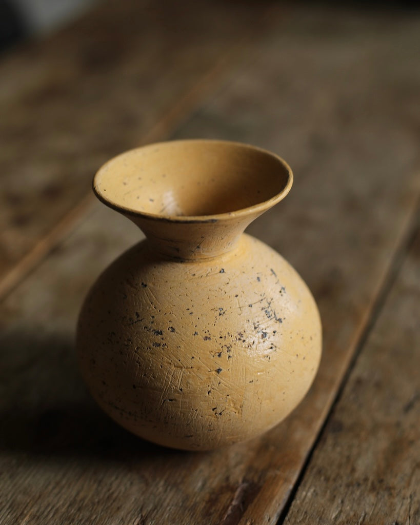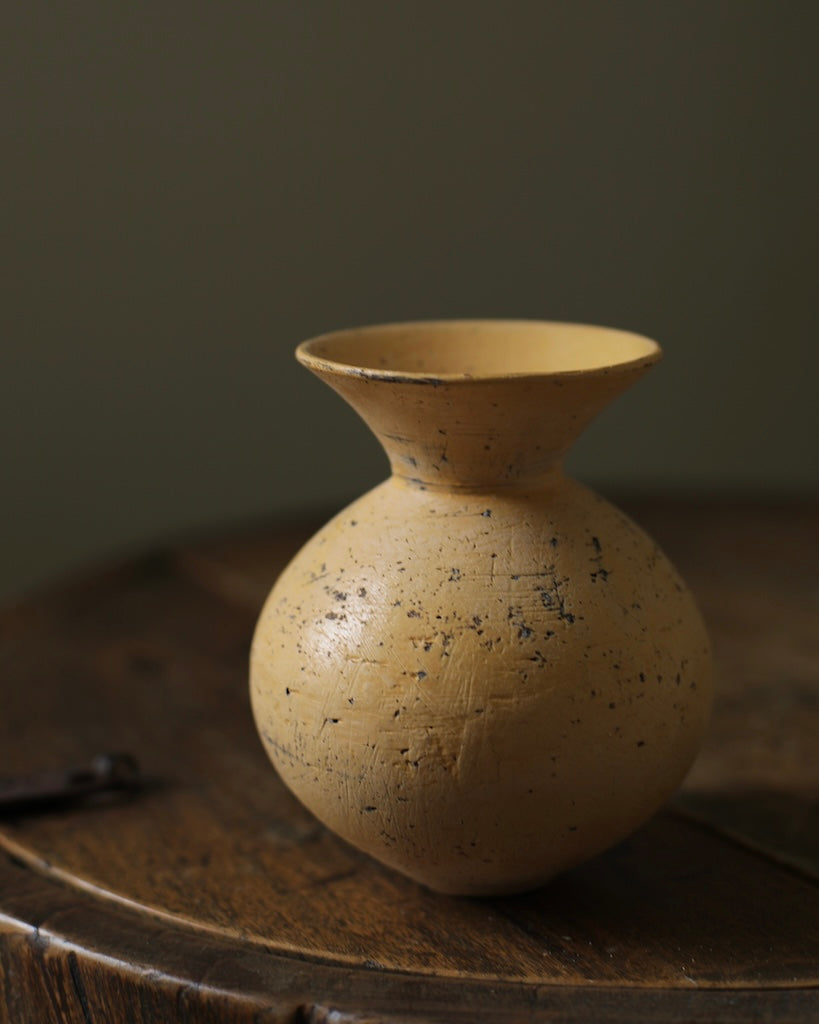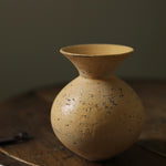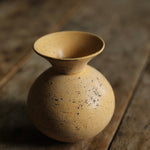 Description: A small vase with a rounded body rising from a narrow base and tapering in again toward a conical opening. Finished in Ozawa’s distinctive manner, the surface is brushed with layered tones of umber yellow and earthy neutrals, revealing subtle traces of the dark clay beneath.