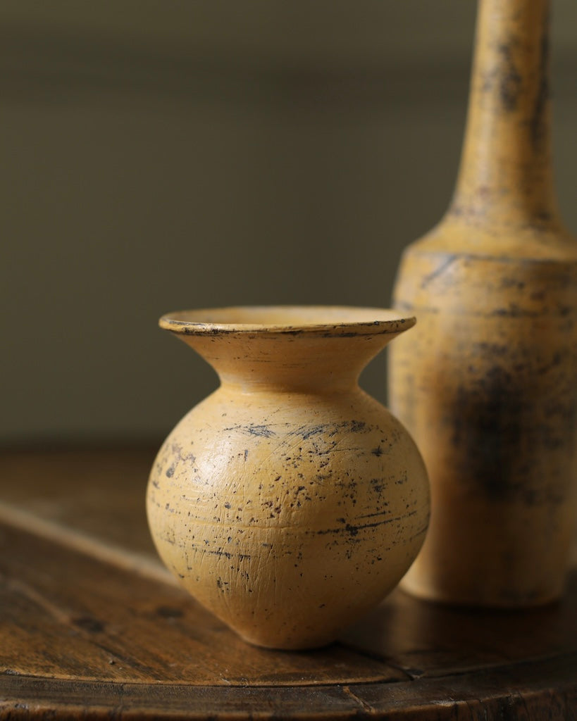 Description: A small vase with a rounded body rising from a narrow base and tapering in again toward a conical opening. Finished in Ozawa’s distinctive manner, the surface is brushed with layered tones of umber yellow and earthy neutrals, revealing subtle traces of the dark clay beneath.