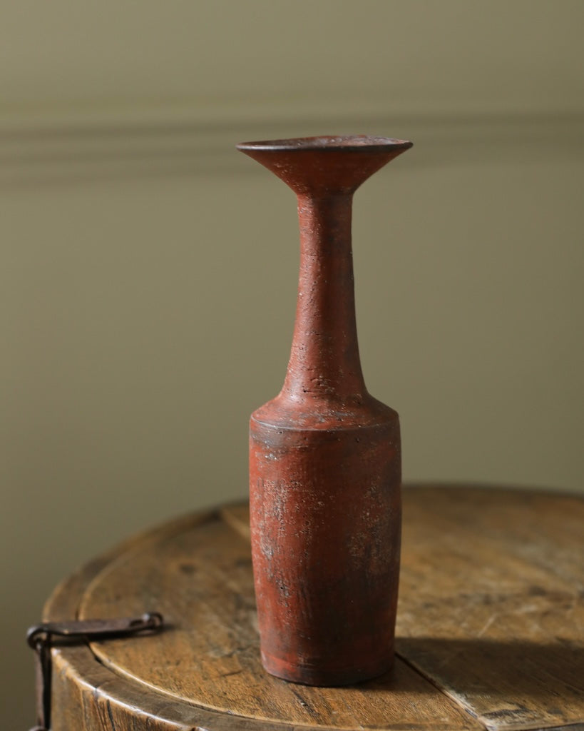 Description: This vessel features a cylindrical base that tapers into a slender neck, which gently flares at the rim. Finished in Ozawa’s signature style, a deep umber-red glaze is brushed over the dark clay surface.