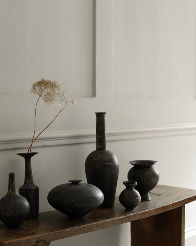 Method: The body of this elegant vessel is made from black clay. A traditional Japanese glaze is then applied, Chara, and 'kofuki', a dusting technique, to create his interesting and uneven surfaces.
