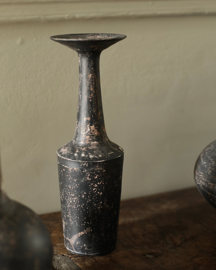 Description: This vessel features a cylindrical base that tapers into a slender neck, which gently flares at the rim. Finished in Ozawa’s distinctive manner, the surface is brushed with a mixture of dark blacks and natural tones.