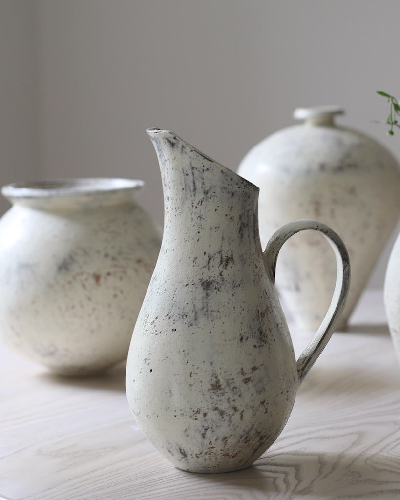This elegantly crafted white jug stands tall, with a pouring spout that flows upwards and elongates the stature. The lower component of the body is defined by rounded curvature that flows inwards. The handle gently curves over, looped in the shape of a raindrop. This jug plays with textures and tones, subtly revealing glimpses of the underlying surface’s earthy hues. The flecks and strokes contrast the white colouring of the jug, adding intrigue and enhancing the rough surface. The uneven texture and the subtle glisten of the white surface provide the piece with complexity. The jug is meticulously crafted and has a beautifully rendered form with a timeless feel. It embodies the versatility of Ozawa’s works, allowing for individual interpretation, use, and purpose. His tableware is made 'imperfect' with the hope that the pieces will continually evolve through daily use. This jug will bring joy, whether used or displayed, as a precious piece full of character.