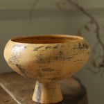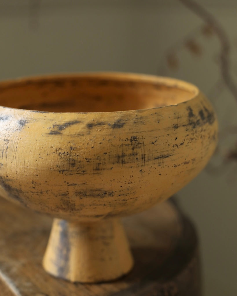 Description: A wide bowl that gently curves in at the rim, raised on a conical foot. Formed from black clay and finished in Ozawa’s characteristic style, the surface is brushed with a muted umber-yellow glaze that allows the depth of the underlying clay to remain visible.