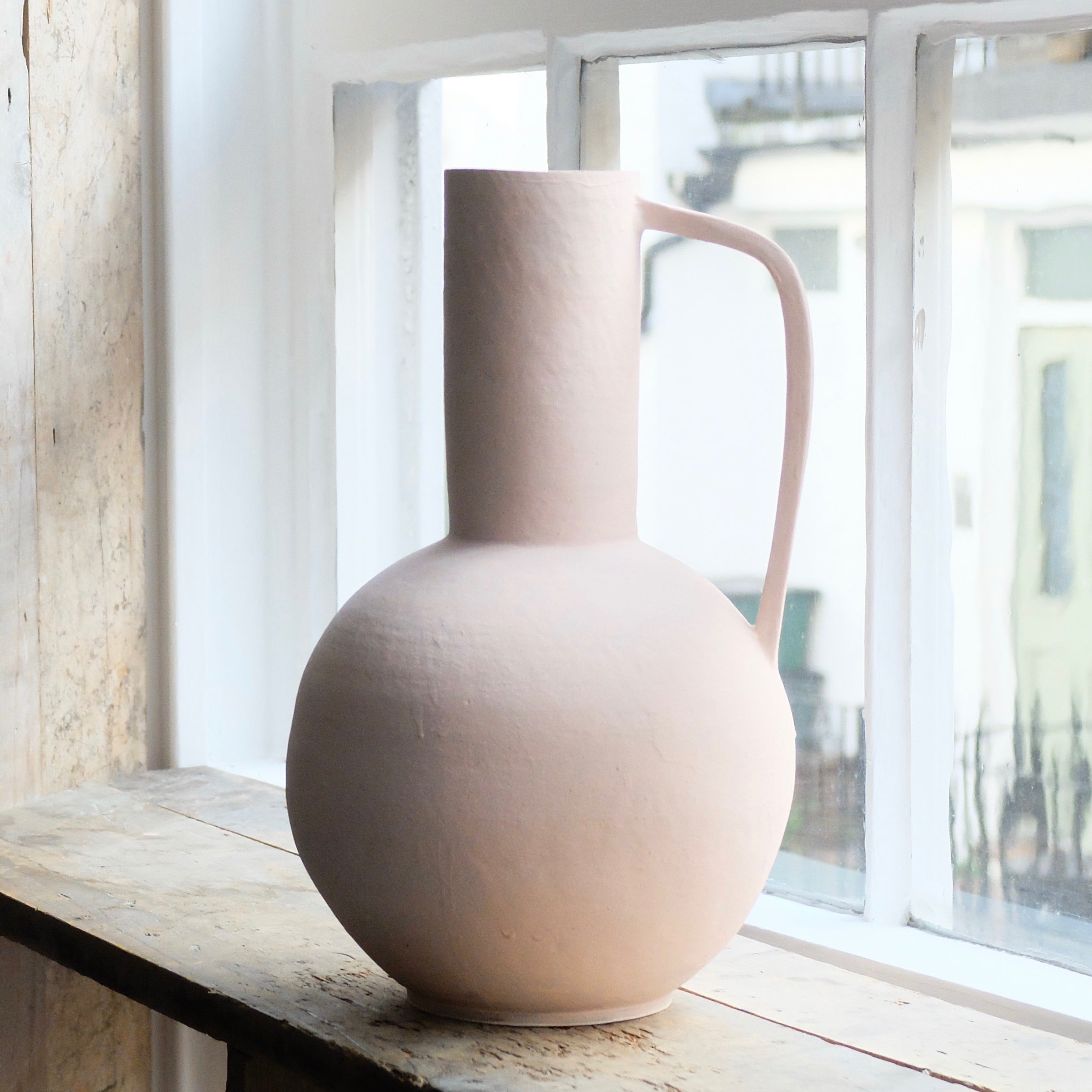 Wheel thrown in sections and assembled these vases are hand painted with mat engobes and fired between 1240 and 1260.