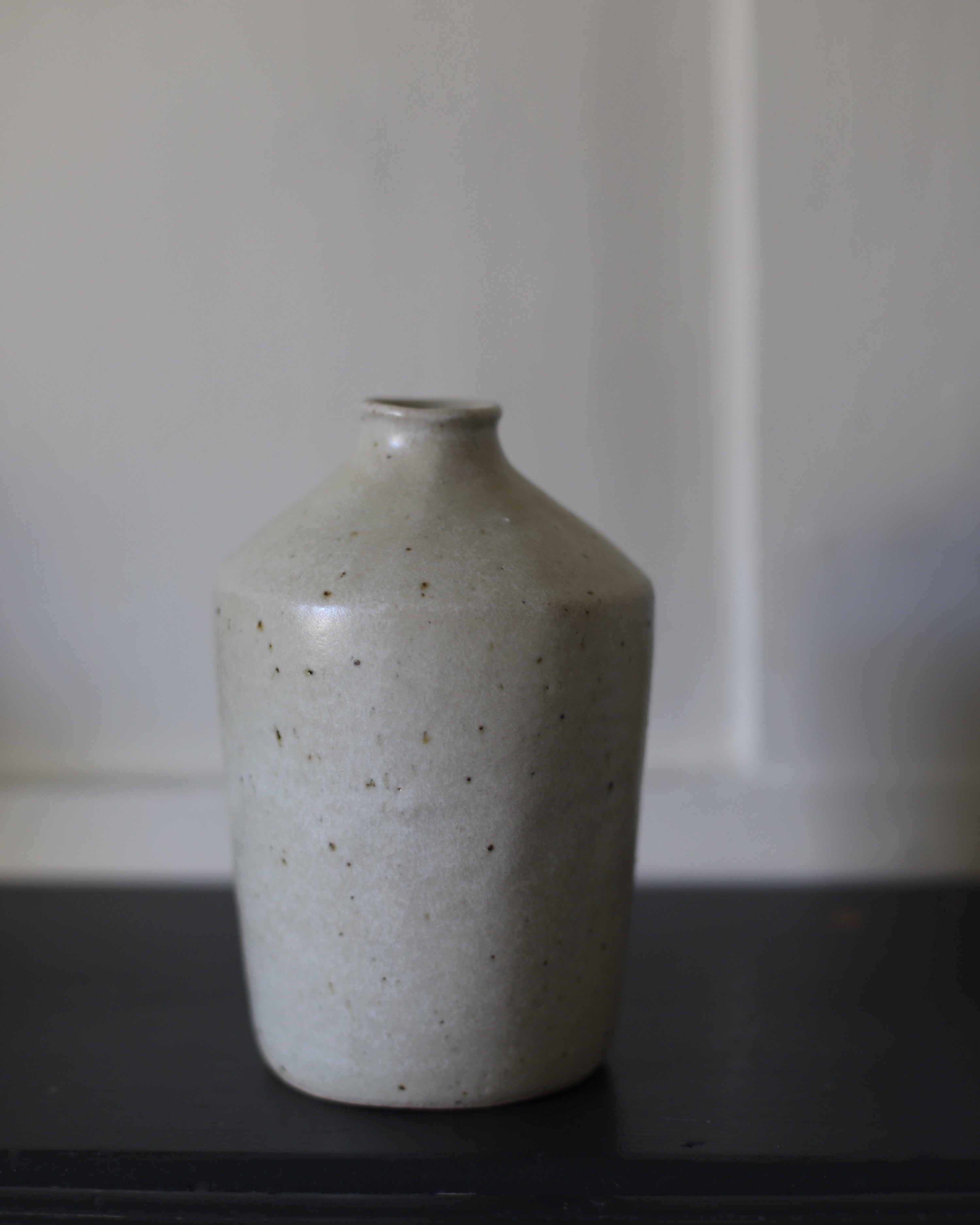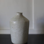 A smaller sized, tactile vessel hand-built using pinch and coil techniques. The process of creating such vessels is physical, requiring the artist to use their whole body to form its structure. Harrison's focus is on functional ceramics that embrace the slow and imperfect process of hand-building. She showcases the physicality of hand-built ceramics with haptic marks and traces of touch. The vessel is made from neutral white stoneware with iron flecks and complemented by soft markings and a washy satin glaze.