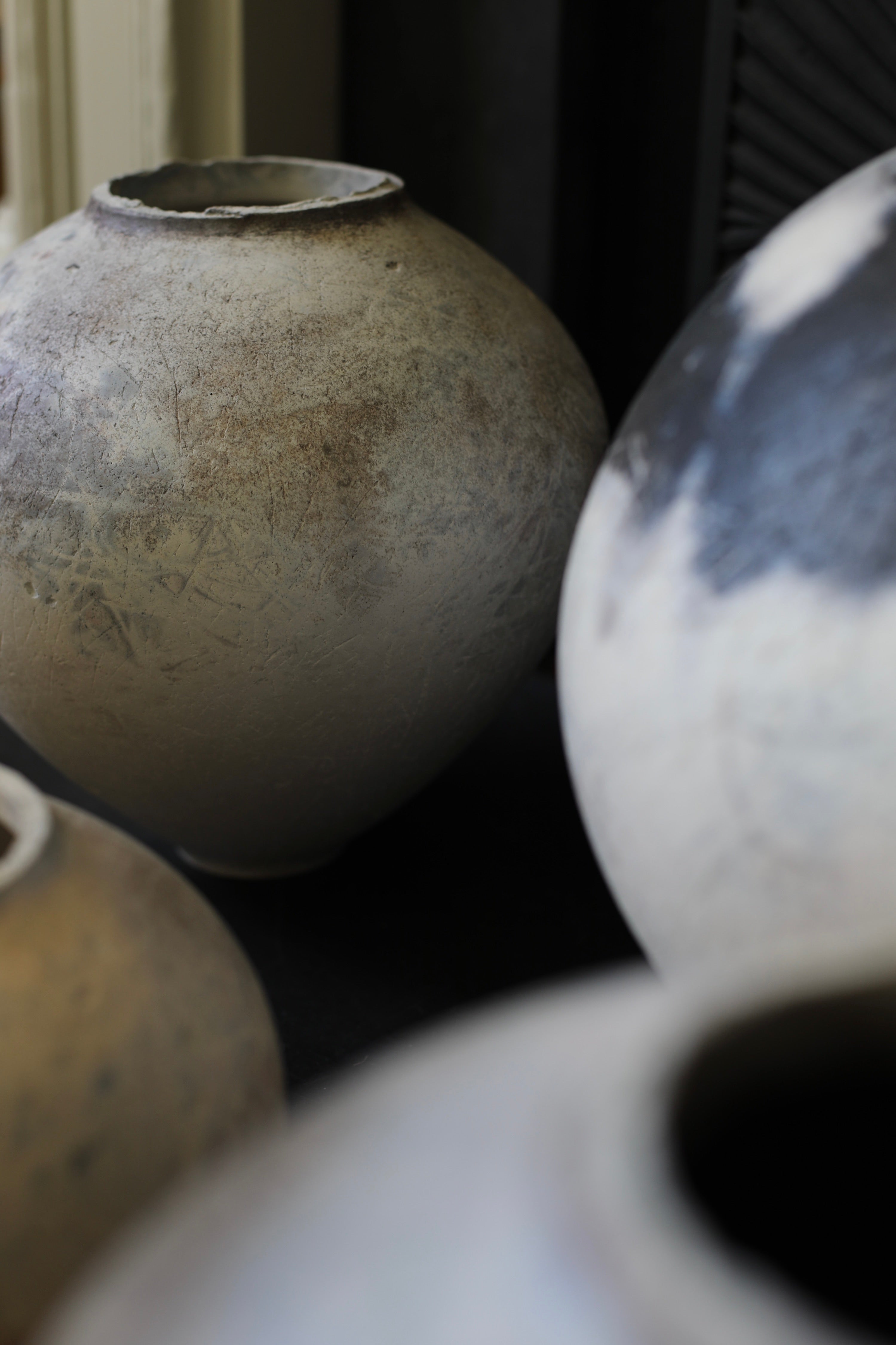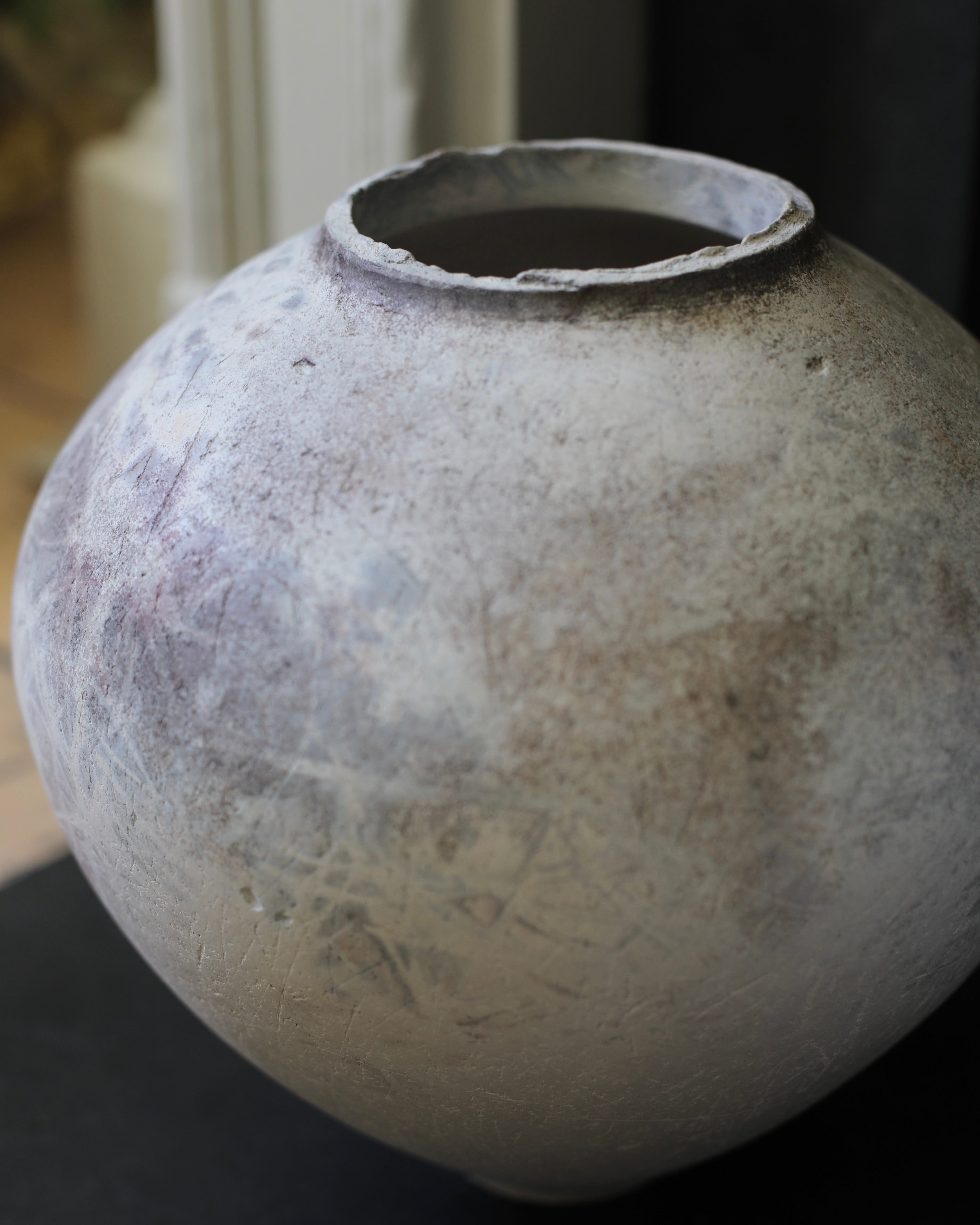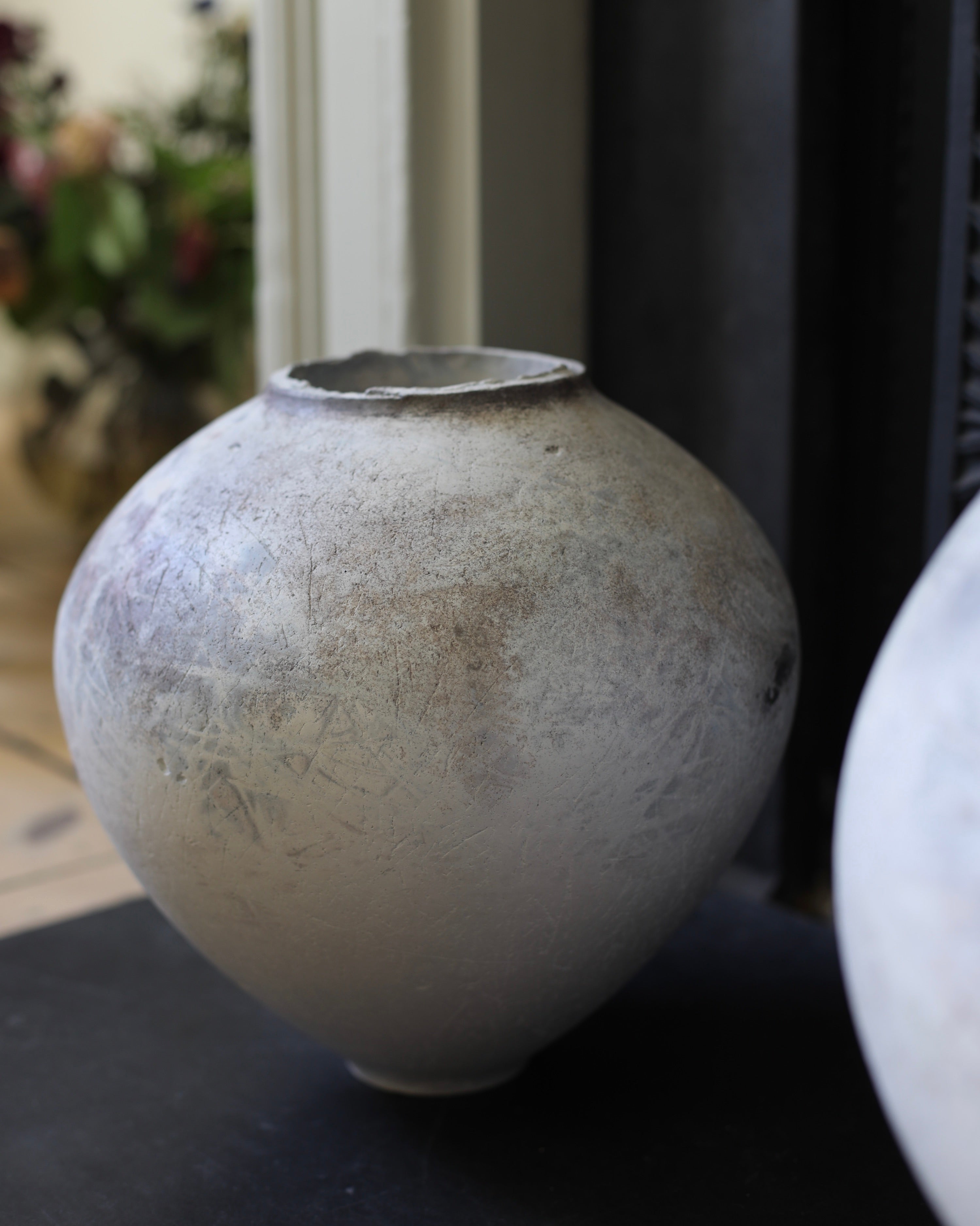 Handbuilt by ceramicist Victoria Meadows, who prefers the thoughtfully slow and methodical nature of coil building through pinching coils of clay to grow and thin the walls of her spectacular moon jars. When built, a found object such as a shell is scraped over the clay to even the exterior surface. This is followed by a light burnish with a smooth pebble giving a gentle sheen. At this stage the marks remaining, tell a story. Subtle reminders, from light indentations left behind, that it was made by hand. Once the piece is dry, fine layers of terra sigillata, a super fine clay slip, are applied giving a lovely milky quality. All other surface decoration comes from plant life tightly wrapped around the jar and fired within a protective saggar. The plant life and the wood Meadows uses to fire with and the elemental conditions on the day of firing all dictate the final decorative results, drawing abstract marks in shades of blue grey, charcoal, taupe, soft blush pinks and crisp white.