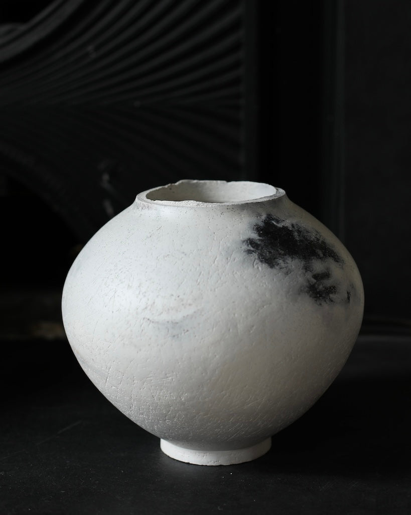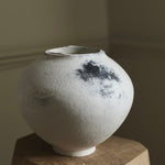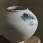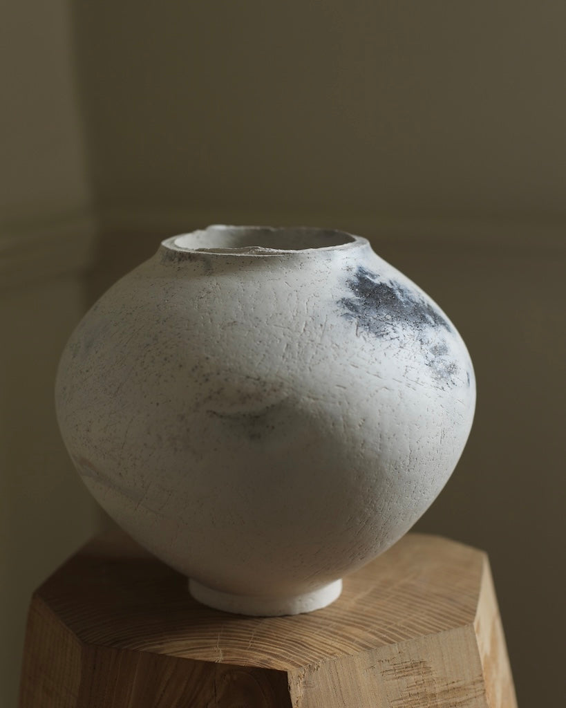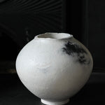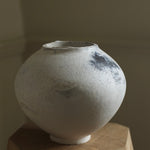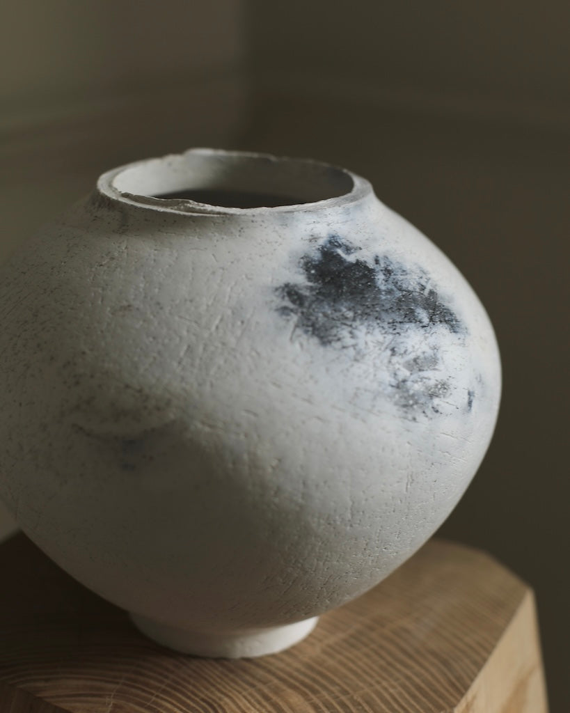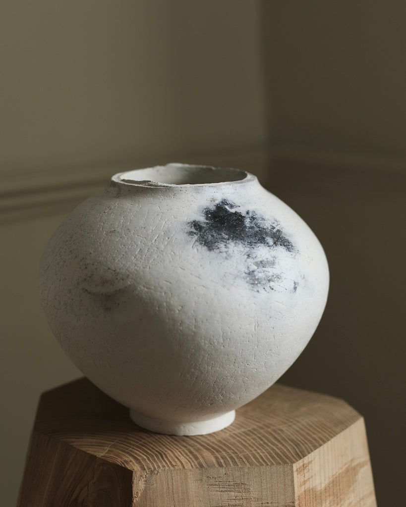 Handbuilt by ceramicist Victoria Meadows, who prefers the thoughtfully slow and methodical nature of coil building through pinching coils of clay to grow and thin the walls of her spectacular moon jars. When built, a found object such as a shell is scraped over the clay to even the exterior surface. This is followed by a light burnish with a smooth pebble giving a gentle sheen. At this stage the marks remaining, tell a story. Subtle reminders, from light indentations left behind, that it was made by hand. Once the piece is dry, fine layers of terra sigillata, a super fine clay slip, are applied giving a lovely milky quality. All other surface decoration comes from plant life tightly wrapped around the jar and fired within a protective saggar. The plant life and the wood Meadows uses to fire with and the elemental conditions on the day of firing all dictate the final decorative results, drawing abstract marks in shades of blue grey, charcoal, taupe, and crisp white.