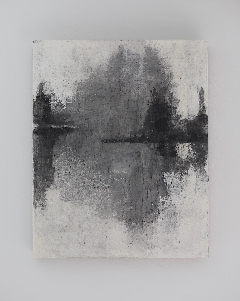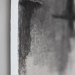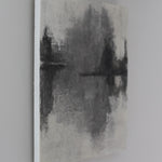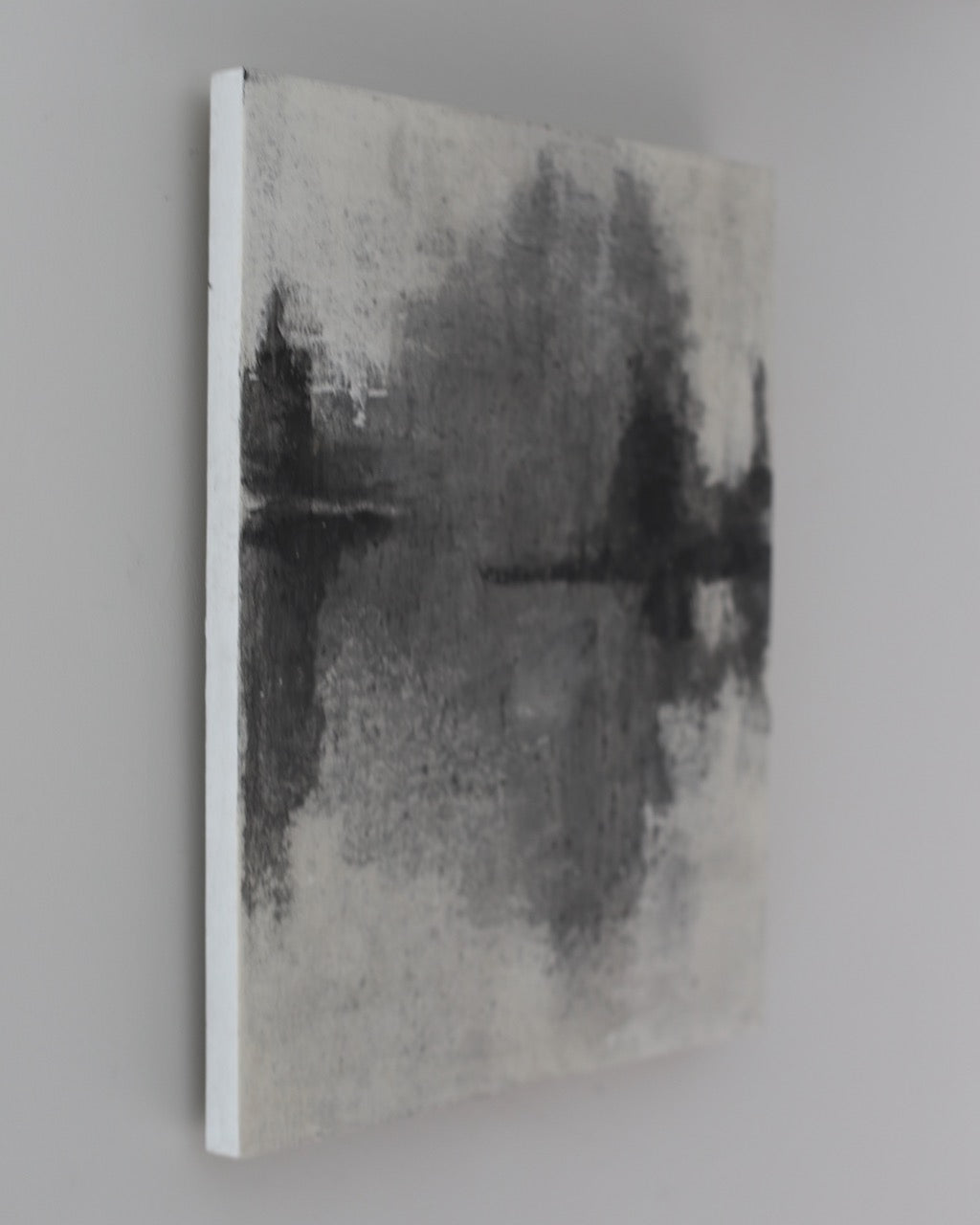 This beautiful wood panel and washi paper piece harmoniously combines a monochromatic palette and abstract composition to celebrate texture and tone. The lighter grey and charcoal are dappled onto a white backdrop, melding in with the white background and creating a textured effect. In doing so, the white specks in the grey mimic glimmers of light, like the glistening between the leaves of a tree or reflections from the surface of the water. This harmonious integration of light and dark and the approach to form elegantly evoke a sense of tranquillity.