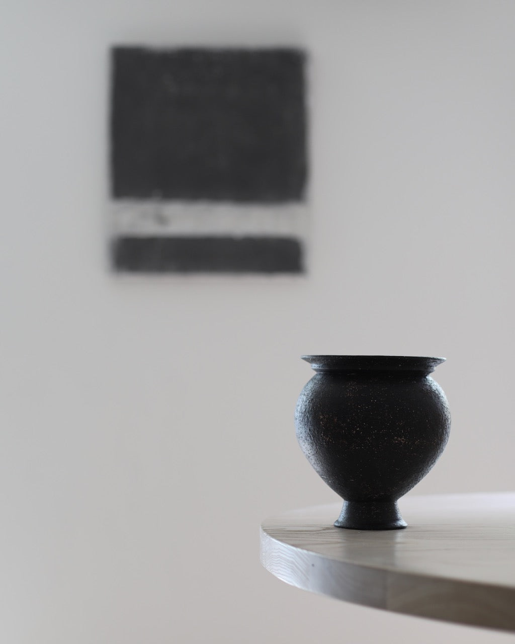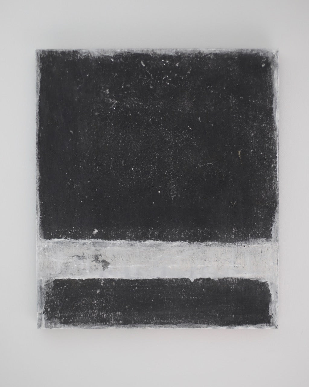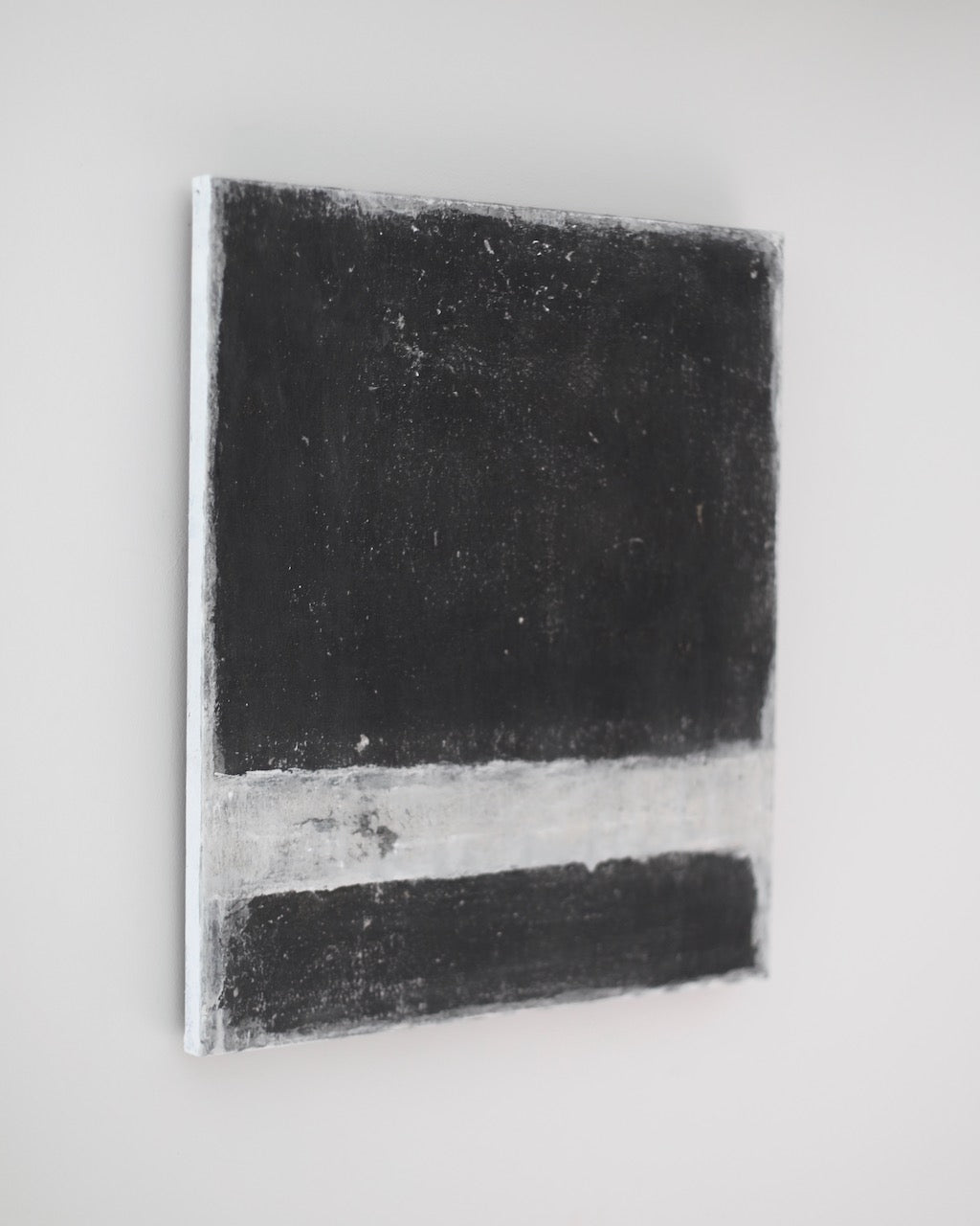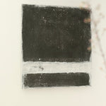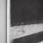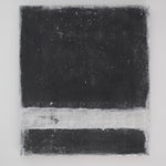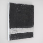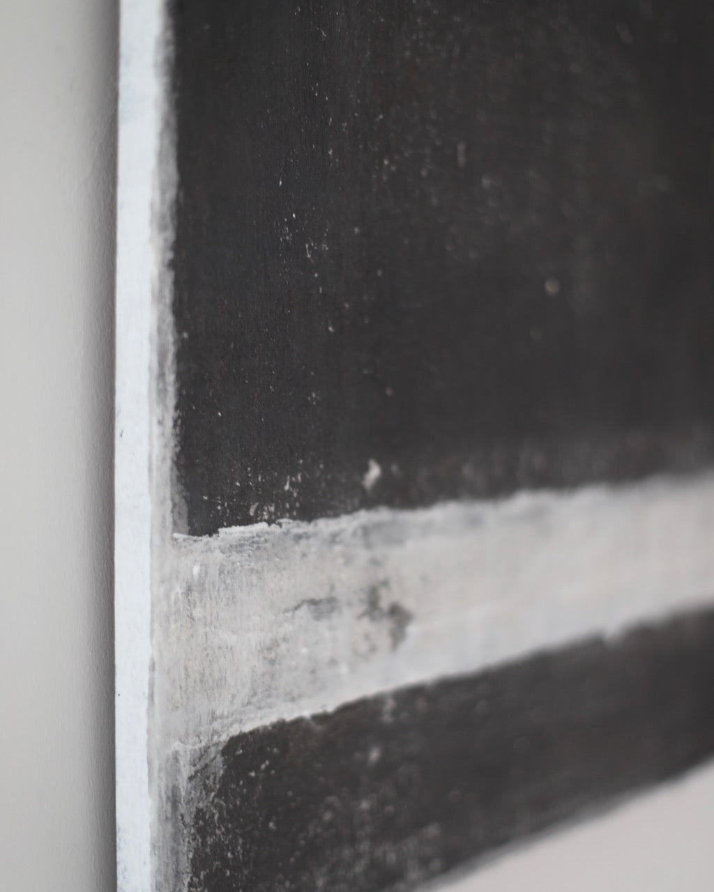 This elegant wood panel and washi paper piece combines a monochromatic palette to present an abstract composition. Taking on a predominately charcoal tone, a white stripe boldly cuts through the lower third of the composition, segmenting the charcoal colour in two. This white is speckled throughout to present an integration of tone and imitate glimmers of light. This white additionally borders the canvas giving it a luminosity. The application of charcoal colour is multidimensional, varying in intensity to harmoniously come together in this piece as a celebration of texture and tones.