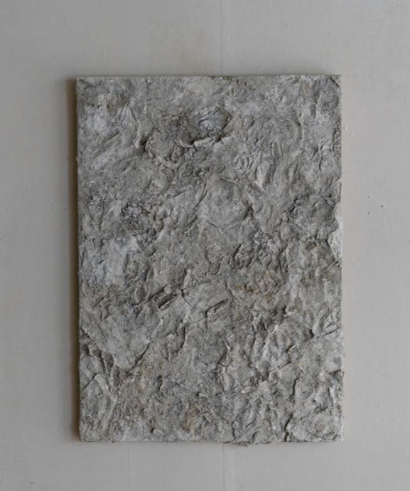Wataru Hatano's work is made from the Kurotani washi, a traditional Japanese paper. Washi is hand-made by first separating the inner bark of the plant and pounding it. This pounded version of the Kozo inner bark is added to a liquid solution and mixed with tororo-aoi (fermented hibiscus root), resulting in a paste-like substance. Each sheet of paper is made by spreading this paste across a su (bamboo mesh screen) evenly. Sheets are subsequently left to dry. His intricately textured surfaces are then achieved through a combination of soil, pigment, acrylic and Japanese paper on a wooden board.